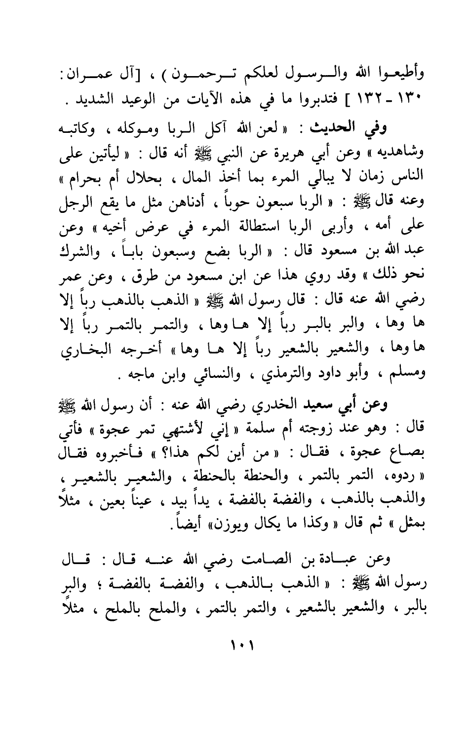 وفي الحديث: " لعن الله آكل الربا وموكله، وكاتبه وشاهديه " 1 وعن أبي هريرة عن النبي صلى الله عليه وسلم أنه قال: " ليأتين على الناس زمان لا يبالي المرء بما أخذ المال، بحلال أم بحرام " 2 وعنه قال صلى الله عليه وسلم " الربا سبعون حوبا، أدناهن مثل ما يقع الرجل على أمه، وأربى الربا استطالة المرء في عرض أخيه " 3 وعن عبد الله بن مسعود قال: " الربا بضع وسبعون بابا، والشرك نحو ذلك " وقد روي هذا عن ابن مسعود من طرق، وعن عمر رضي الله عنه قال: قال رسول الله صلى الله عليه وسلم " الذهب بالذهب ربا إلا ها وها، والبر بالبر ربا إلا ها وها، والتمر بالتمر ربا إلا ها وها، والشعير بالشعير ربا إلا ها وها " 4 أخرجه البخاري ومسلم، وأبو داود والترمذي، والنسائي وابن ماجه.