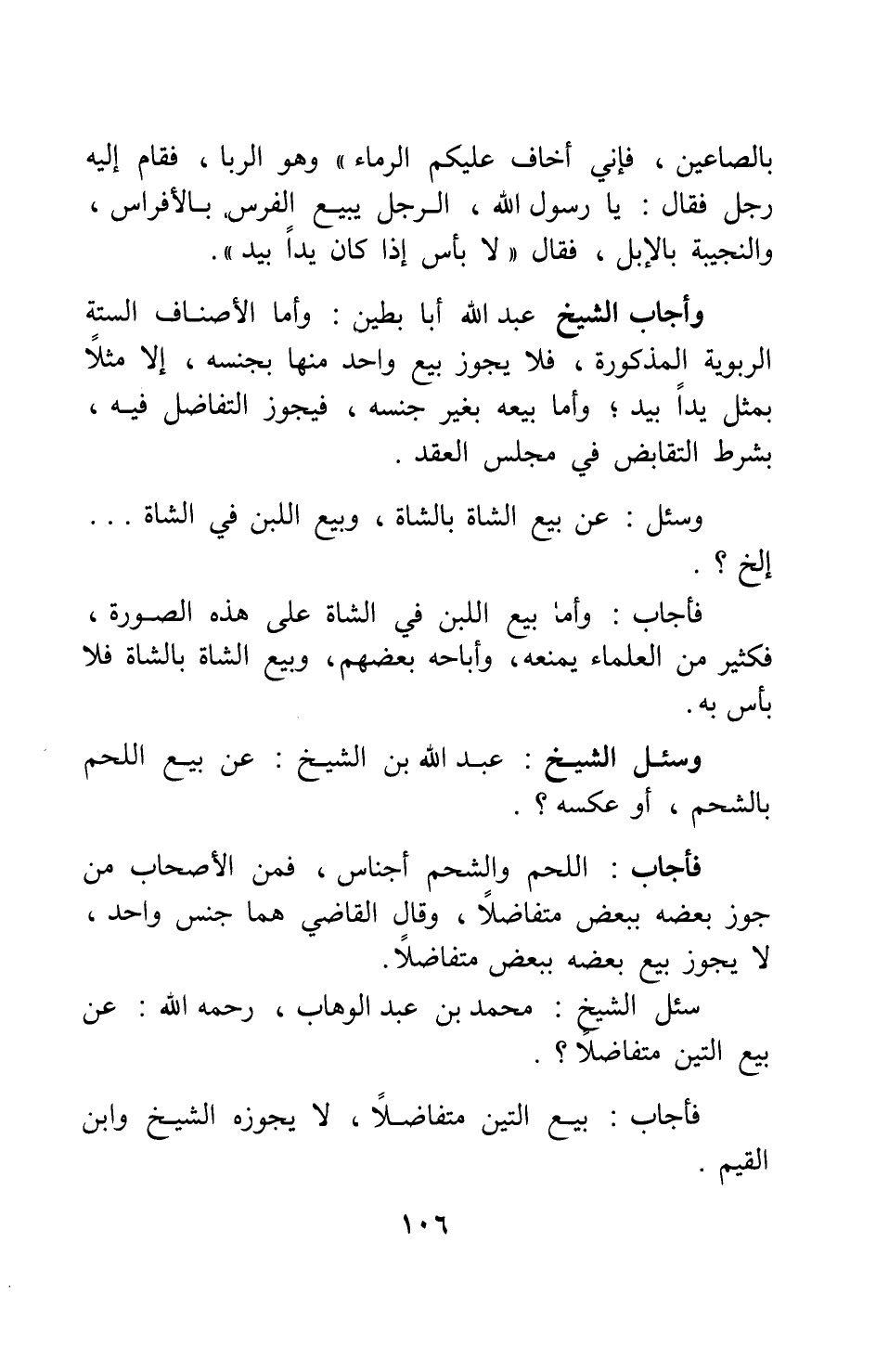 وأجاب الشيخ عبد الله أبا بطين: وأما الأصناف الستة الربوية المذكورة، فلا يجوز بيع واحد منها بجنسه، إلا مثلا بمثل يدا بيد، وأما بيعه بغير جنسه، فيجوز التفاضل فيه، بشرط التقابض في مجلس العقد.