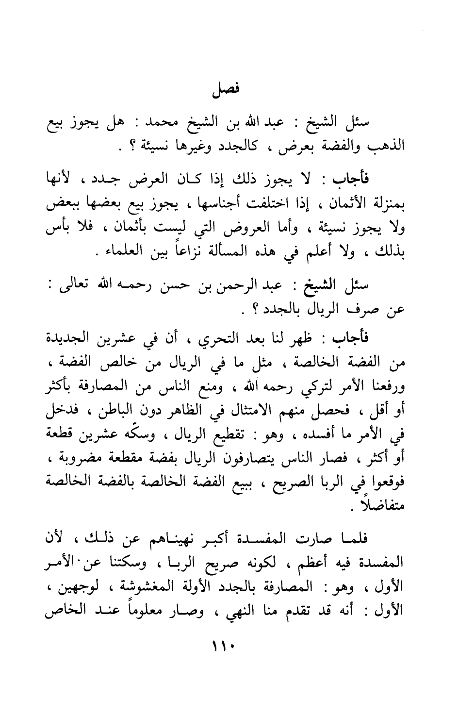 فأجاب: ظهر لنا بعد التحري، أن في عشرين الجديدة من الفضة الخالصة، مثل ما في الريال من خالص الفضة، ورفعنا الأمر لتركي - رحمه الله -، ومنع الناس من المصارفة بأكثر أو أقل، فحصل منهم الامتثال في الظاهر دون الباطن، فدخل في الأمر ما أفسده وهو: تقطيع الريال، وسكه عشرين قطعة أو أكثر، فصار الناس يتصارفون الريال بفضة مقطعة مضروبة، فوقعوا في الربا الصريح، ببيع الفضة الخالصة بالفضة الخالصة متفاضلا. فلما صارت المفسدة أكبر نهيناهم عن ذلك، لأن المفسدة فيه أعظم، لكونه صريح الربا، وسكتنا عن الأمر الأول، وهو: المصارفة بالجدد الأولى المغشوشة، لوجهين: