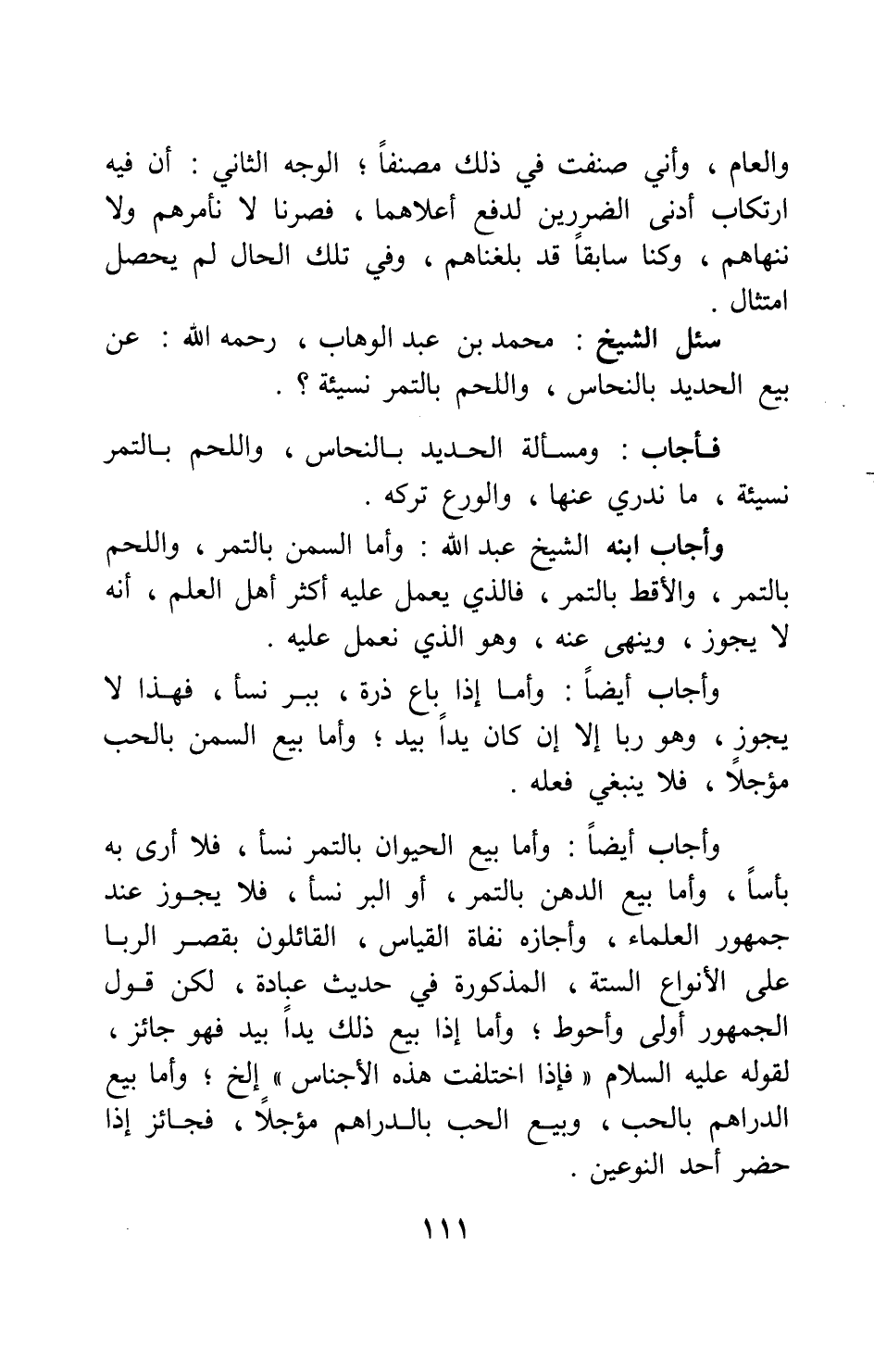 فأجاب: ومسألة الحديد بالنحاس، واللحم بالتمر نسيئة، ما ندري عنها، والورع تركه. وأجاب ابنه الشيخ عبد الله: وأما السمن بالتمر، واللحم بالتمر، والأقط بالتمر، فالذي يعمل عليه أكثر أهل العلم، أنه لا يجوز، وينهى عنه، وهو الذي نعمل عليه.
