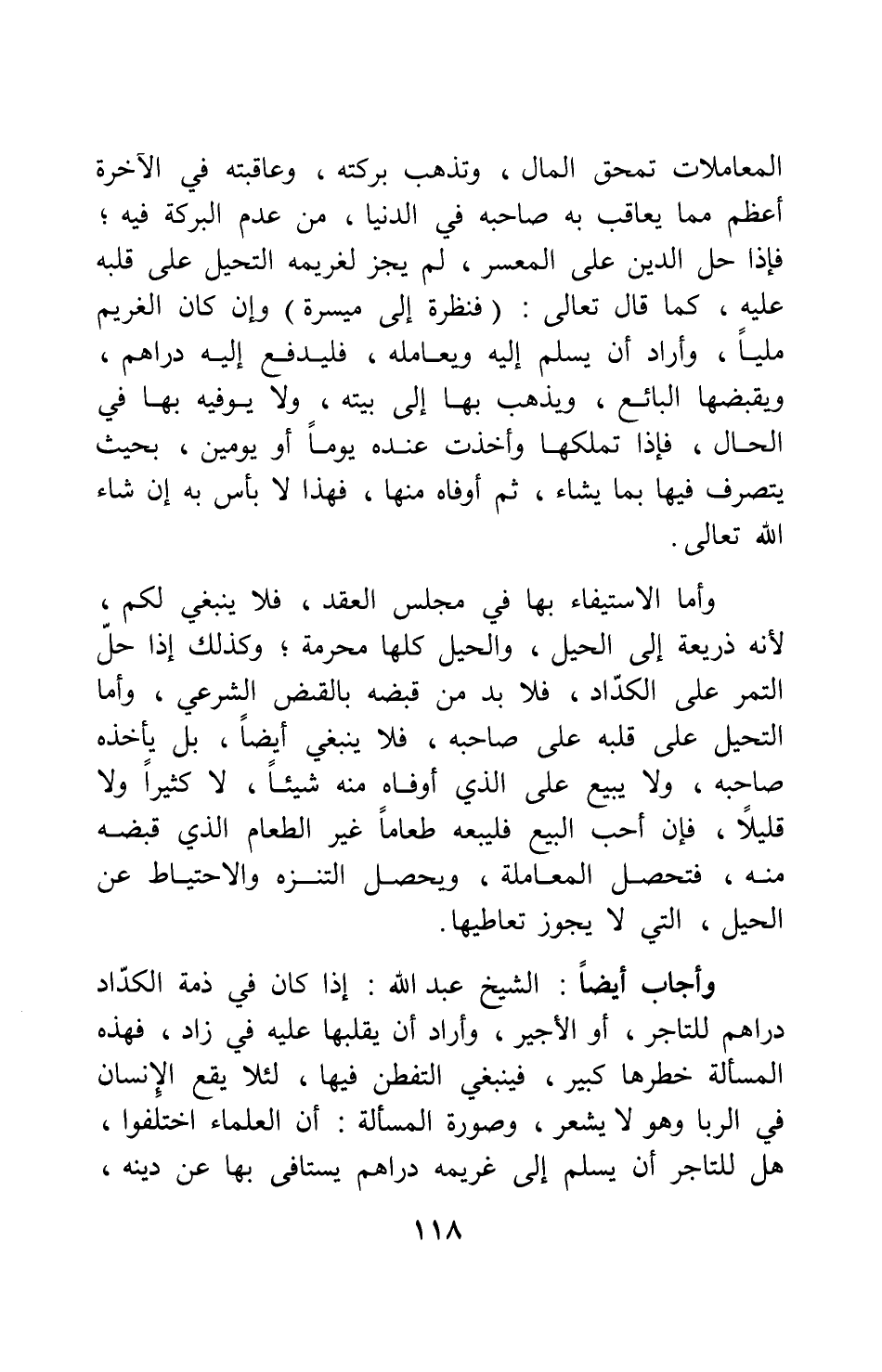 المعاملات تمحق المال، وتذهب بركته، وعاقبته في الآخرة أعظم مما يعاقب به صاحبه في الدنيا، من عدم البركة فيه، فإذا حل الدين على المعسر، لم يجز لغريمه التحيل على قلبه عليه، كما قال تعالى: {فَنَظِرَةٌ إِلَى مَيْسَرَةٍ} 1 وإن كان الغريم مليا، وأراد أن يسلم إليه ويعامله، فليدفع إليه دراهم، ويقبضها البائع، ويذهب بها إلى بيته، ولا يوفيه بها في الحال، فإذا تملكها وأخذت عنده يوما أو يومين، بحيث يتصرف فيها بما يشاء، ثم أوفاه منها، فهذا لا بأس به إن شاء الله تعالى.