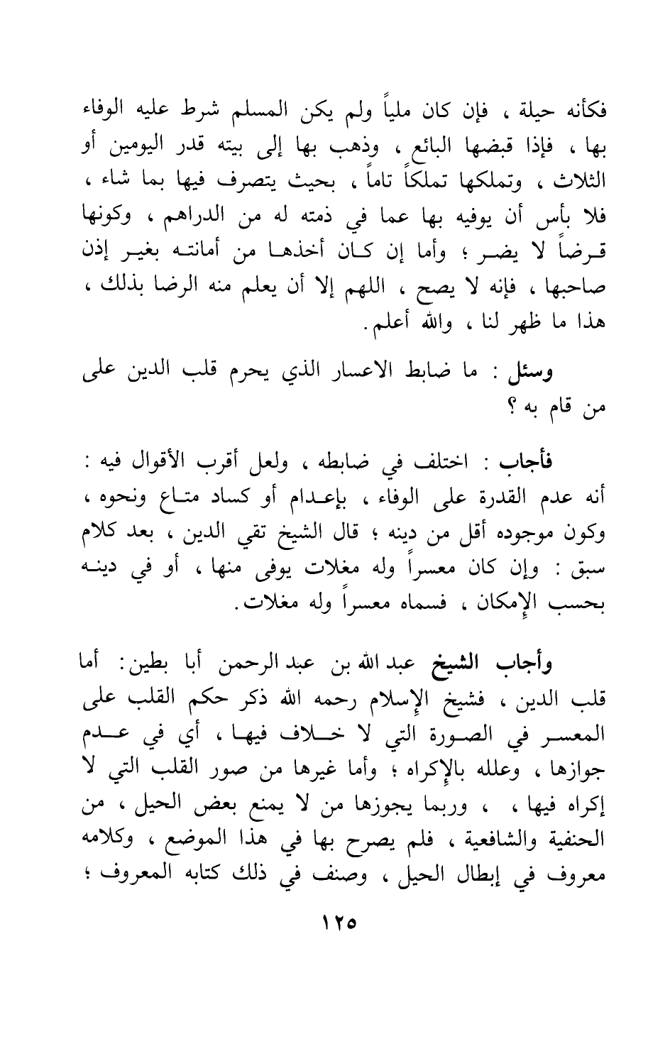 وأجاب الشيخ عبد الله بن عبد الرحمن أبا بطين: أما قلب الدين، فشيخ الإسلام - رحمه الله - ذكر حكم القلب على المعسر في الصورة التي لا خلاف فيها، أي في عدم جوازها، وعلله بالإكراه، وأما غيرها من صور القلب التي لا إكراه فيها،، وربما يجوزها من لا يمنع بعض الحيل، من الحنفية والشافعية، فلم يصرح بها في هذا الموضع، وكلامه معروف في إبطال الحيل، وصنف في ذلك كتابه المعروف،