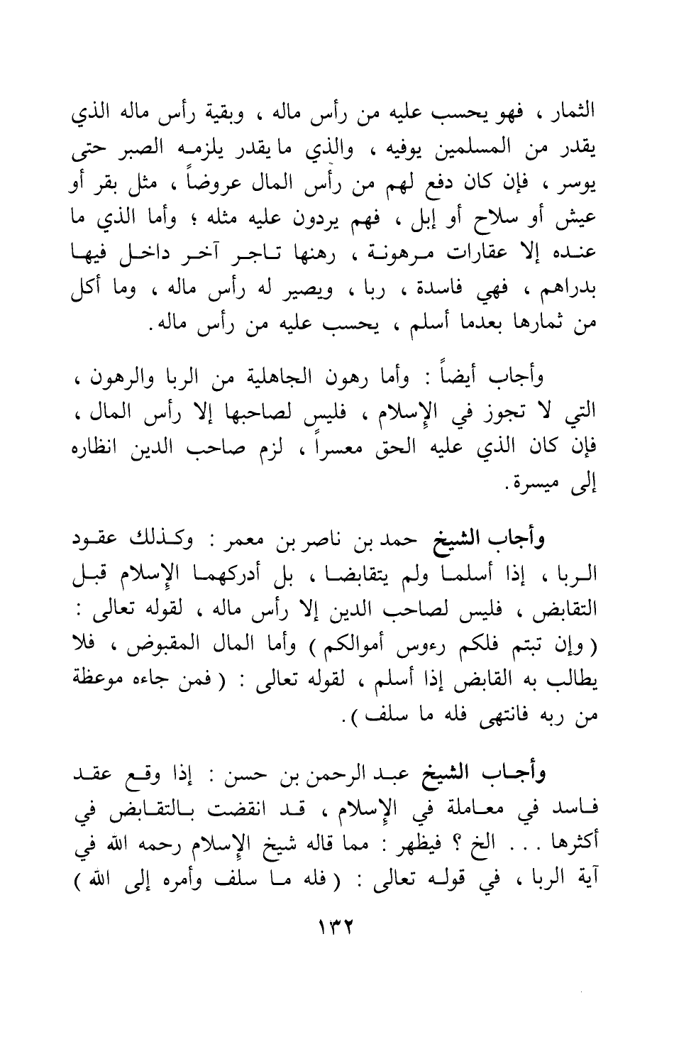 وأجاب الشيخ حمد بن ناصر بن معمر: وكذلك عقود الربا، إذا أسلما ولم يتقابضا، بل أدركهما الإسلام قبل التقابض، فليس لصاحب الدين إلا رأس ماله، لقوله تعالى: {وَإِنْ تُبْتُمْ فَلَكُمْ رُؤُوسُ أَمْوَالِكُمْ} [سورة البقرة آية: 279] وأما المال المقبوض، فلا يطالب به القابض إذا أسلم، لقوله تعالى: {فَمَنْ جَاءَهُ مَوْعِظَةٌ مِنْ رَبِّهِ فَانْتَهَى فَلَهُ مَا سَلَفَ} [سورة البقرة آية: 275] .