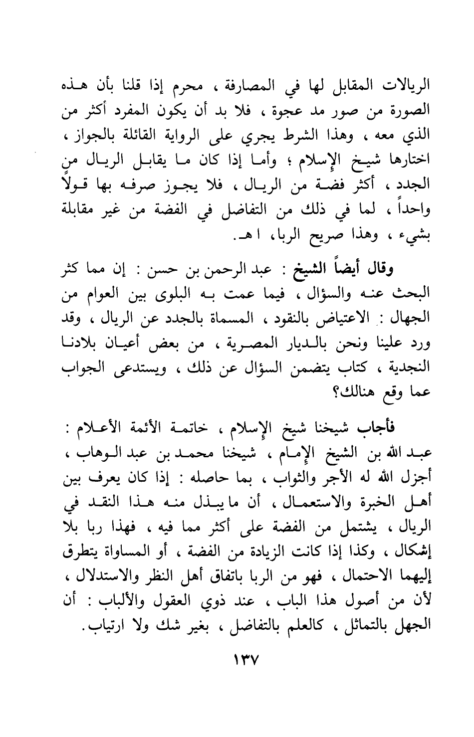 وقال أيضا الشيخ: عبد الرحمن بن حسن: إن مما كثر البحث عنه والسؤال، فيما عمت به البلوى بين العوام من الجهال: الاعتياض بالنقود المسماة بالجدد عن الريال، وقد ورد علينا ونحن بالديار المصرية، من بعض أعيان بلادنا النجدية، كتاب يتضمن السؤال عن ذلك، ويستدعي الجواب عما وقع هنالك؟