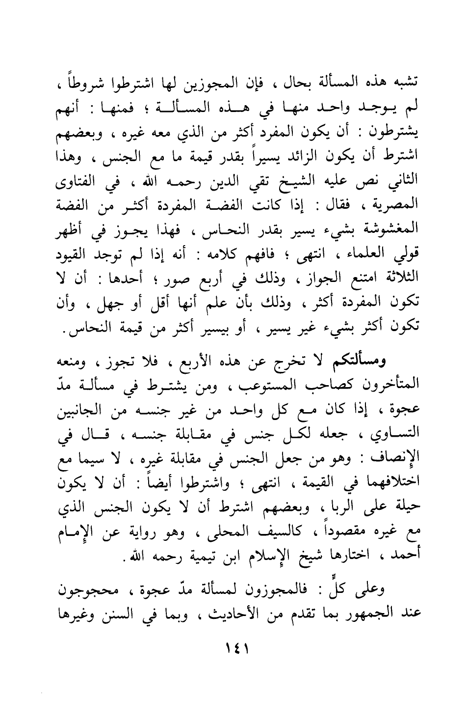 واشترطوا أيضا: أن لا يكون حيلة على الربا، وبعضهم اشترط أن لا يكون الجنس الذي مع غيره مقصودا كالسيف المحلى، وهو رواية عن الإمام أحمد، اختارها شيخ الإسلام ابن تيمية - رحمه الله -.