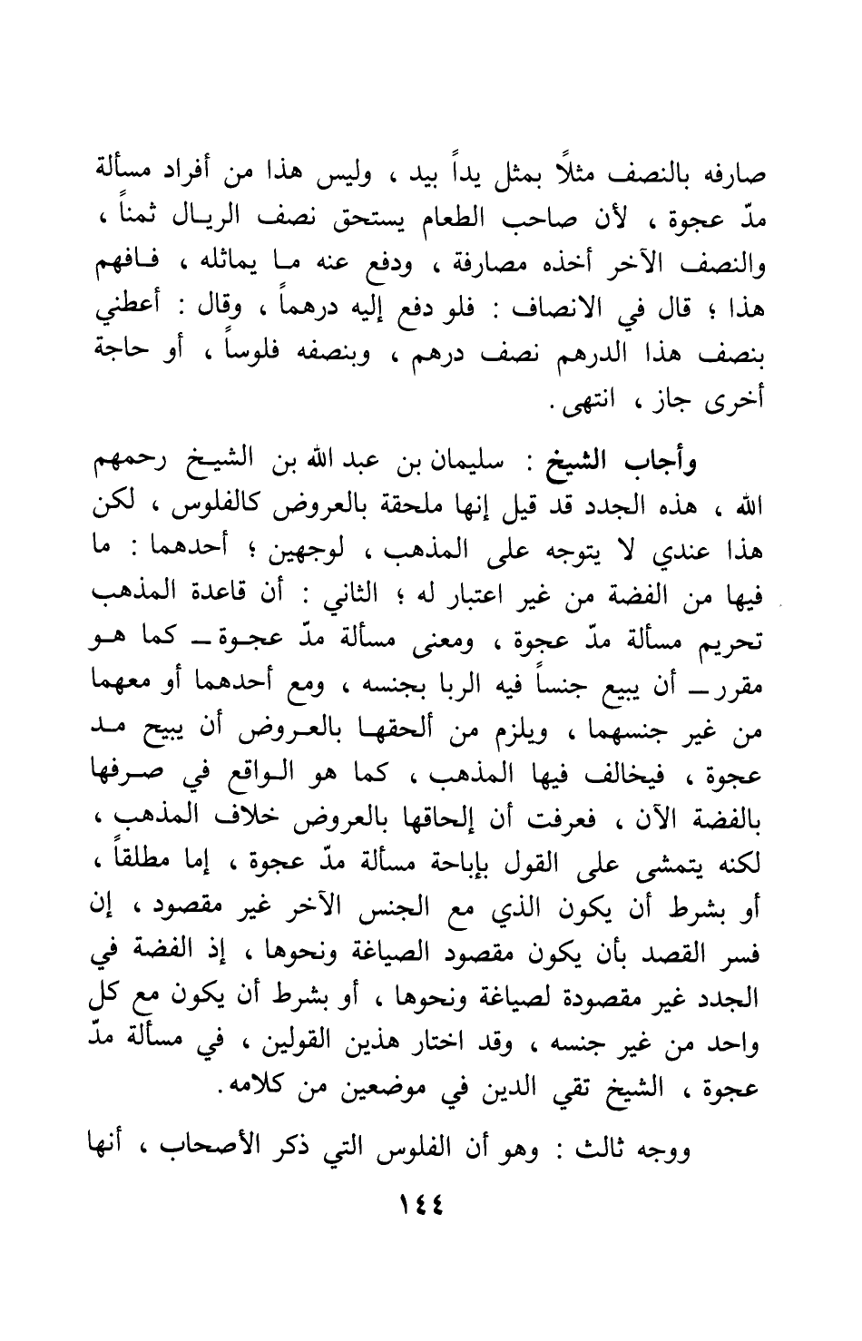 وأجاب الشيخ: سليمان بن عبد الله بن الشيخ رحمهم الله، هذه الجدد قد قيل إنها ملحقة بالعروض كالفلوس، لكن هذا عندي لا يتوجه على المذهب، لوجهين،