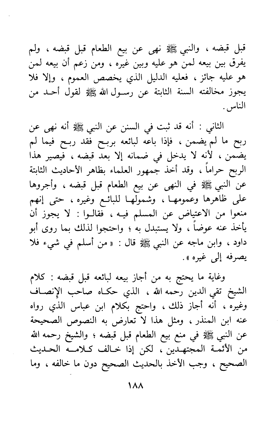 وغاية ما يحتج به من أجاز بيعه لبائعه قبل قبضه: كلام الشيخ تقي الدين - رحمه الله -، الذي حكاه صاحب الإنصاف وغيره، أنه أجاز ذلك، واحتج بكلام ابن عباس الذي رواه عنه ابن المنذر، ومثل هذا لا تعارض به النصوص الصحيحة عن النبي صلى الله عليه وسلم في منع بيع الطعام قبل قبضه، والشيخ رحمه الله من الأئمة المجتهدين، لكن إذا خالف كلامه الحديث الصحيح، وجب الأخذ بالحديث الصحيح دون ما خالفه، وما