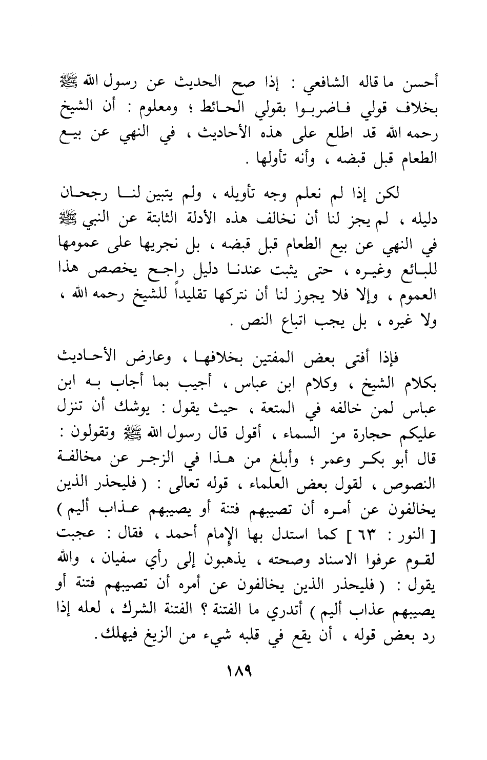 فإذا أفتى بعض المفتين بخلافها، وعارض الأحاديث بكلام الشيخ، وكلام ابن عباس، أجيب بما أجاب به ابن عباس لمن خالفه في المتعة، حيث يقول: "يوشك أن تنْزل عليكم حجارة من السماء أقول قال رسول الله صلى الله عليه وسلم وتقولون: قال أبو بكر وعمر" وأبلغ من هذا في الزجر عن مخالفة النصوص، لقول بعض العلماء، قوله تعالى: {فَلْيَحْذَرِ الَّذِينَ يُخَالِفُونَ عَنْ أَمْرِهِ أَنْ تُصِيبَهُمْ فِتْنَةٌ أَوْ يُصِيبَهُمْ عَذَابٌ أَلِيمٌ} [سورة النور آية: 63] ، كما استدل بها الإمام أحمد، فقال: عجبت لقوم عرفوا الإسناد وصحته، يذهبون إلى رأي سفيان، والله يقول: {فَلْيَحْذَرِ الَّذِينَ يُخَالِفُونَ عَنْ أَمْرِهِ أَنْ تُصِيبَهُمْ فِتْنَةٌ أَوْ يُصِيبَهُمْ عَذَابٌ أَلِيمٌ} [سورة النور آية: 63] أتدري ما الفتنة؟ الفتنة الشرك، لعله إذا رد بعض قوله، أن يقع في قلبه شيء من الزيغ فيهلك.