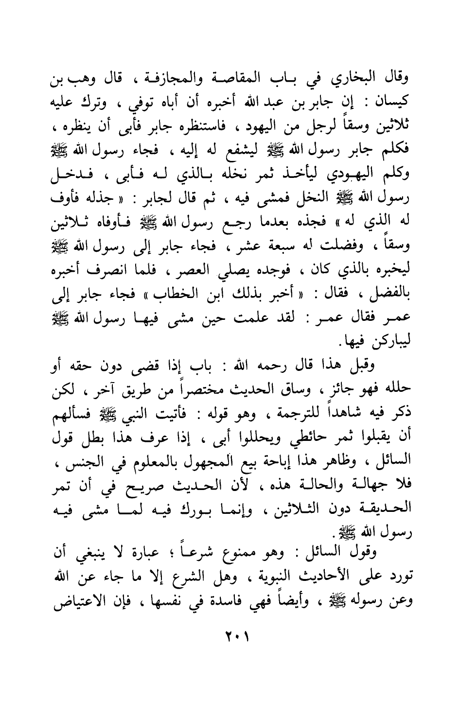 وقال البخاري في باب المقاصة والمجازفة، قال وهب بن كيسان: " إن جابر بن عبد الله أخبره أن أباه توفي، وترك عليه ثلاثين وسقا لرجل من اليهود، فاستنظره جابر فأبى أن ينظره، فكلم جابر رسول الله صلى الله عليه وسلم ليشفع له إليه، فجاء رسول الله صلى الله عليه وسلم وكلم اليهودي ليأخذ ثمر نخله بالذي له فأبى، فدخل رسول الله صلى الله عليه وسلم النخل فمشى فيه، ثم قال لجابر: جُذَّ له فأوف له الذي له فَجَذَّه بعد ما رجع رسول الله صلى الله عليه وسلم فأوفاه ثلاثين وسقا، وفضلت له سبعة عشر، فجاء جابر إلى رسول الله صلى الله عليه وسلم ليخبره بالذي كان، فوجده يصلي العصر، فلما انصرف أخبره بالفضل، فقال: أخبر بذلك ابن الخطاب فجاء جابر إلى عمر فقال عمر: لقد علمت حين مشى فيها رسول الله صلى الله عليه وسلم ليبارَكَنَّ فيها " 1.