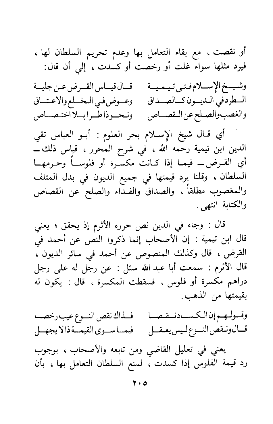 أي قال شيخ الإسلام بحر العلوم: أبو العباس تقي الدين ابن تيمية رحمه الله، في شرح المحرر، قياس ذلك - أي القرض - فيما إذا كانت مكسرة أو فلوسا وحرمها السلطان، وقلنا يرد قيمتها في جميع الديون في بدل المتلف والمغصوب مطلقا، والصداق والفداء والصلح عن القصاص والكتابة انتهى. قال: وجاء في الدين نص حرره الأثرم إذ يحقق ; يعني قال ابن تيمية: إن الأصحاب إنما ذكروا النص عن أحمد في القرض، قال وكذلك المنصوص عن أحمد في سائر الديون، قال الأثرم: سمعت أبا عبد الله سئل: عن رجل له على رجل دراهم مكسرة أو فلوس، فسقطت المكسرة، قال: يكون له بقيمتها من الذهب.