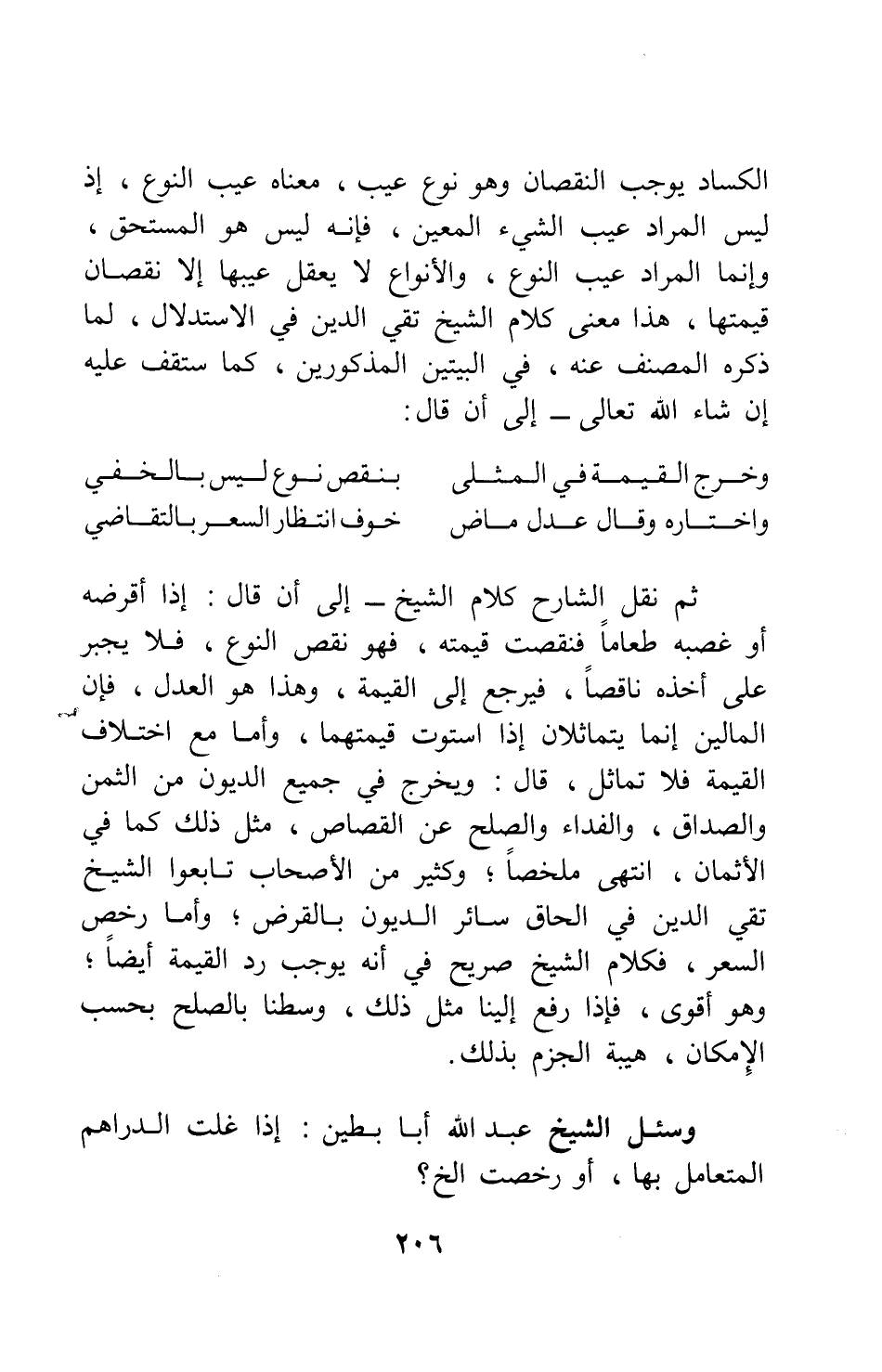 الكساد يوجب النقصان وهو نوع عيب، معناه عيب النوع، إذ ليس المراد عيب الشيء المعين، فإنه ليس هو المستحق، وإنما المراد عيب النوع، والأنواع لا يعقل عيبها إلا نقصان قيمتها، هذا معنى كلام الشيخ تقي الدين في الاستدلال، لما ذكره المصنف عنه، في البيتين المذكورين، كما ستقف عليه إن شاء الله تعالى - إلى أن قال: