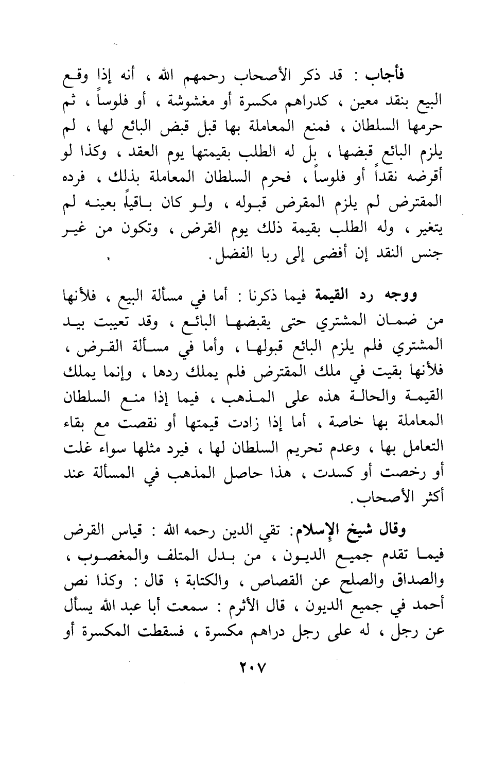 فأجاب: قد ذكر الأصحاب رحمهم الله، أنه إذا وقع البيع بنقد معين، كدراهم مكسرة أو مغشوشة، أو فلوسا، ثم حرمها السلطان، فمنع المعاملة بها قبل قبض البائع لها، لم يلزم البائع قبضها، بل له الطلب بقيمتها يوم العقد، وكذا لو أقرضه نقدا أو فلوسا، فحرم السلطان المعاملة بذلك، فرده المقترض لم يلزم المقرض قبوله، ولو كان باقيا بعينه لم يتغير، وله الطلب بقيمة ذلك يوم القرض، وتكون من غير جنس النقد إن أفضى إلى ربا الفضل.