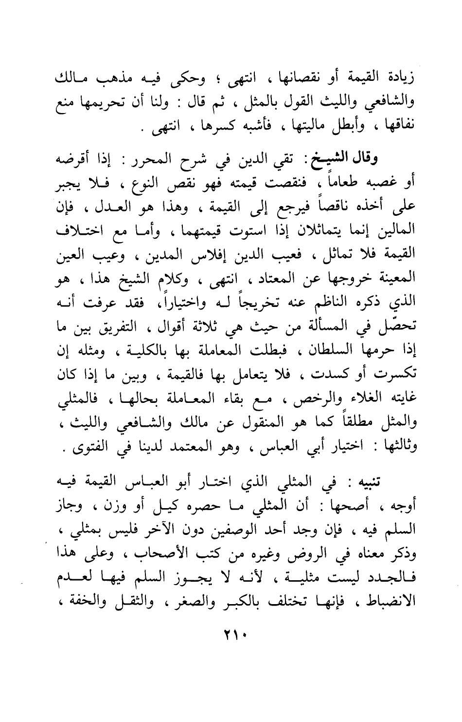وقال الشيخ: تقي الدين في شرح المحرر: إذا أقرضه أو غصبه طعاما، فنقصت قيمته فهو نقص النوع، فلا يجبر على أخذه ناقصا فيرجع إلى القيمة، وهذا هو العدل، فإن المالين إنما يتماثلان إذا استوت قيمتهما، وأما مع اختلاف القيمة فلا تماثل، فعيب الدين إفلاس المدين، وعيب العين المعينة خروجها عن المعتاد، انتهى، وكلام الشيخ هذا، هو الذي ذكره الناظم عنه تخريجا له واختيارا، فقد عرفت أنه تحصل في المسألة من حيث هي ثلاثة أقوال، التفريق بين ما إذا حرمها السلطان، فبطلت المعاملة بها بالكلية، ومثله إن تكسرت أو كسدت، فلا يتعامل بها فالقيمة، وبين ما إذا كان غايته الغلاء والرخص، مع بقاء المعاملة بحالها، فالمثلي والمثل مطلقا كما هو المنقول عن مالك والشافعي والليث، وثالثها: اختيار أبي العباس، وهو المعتمد لدينا في الفتوى.