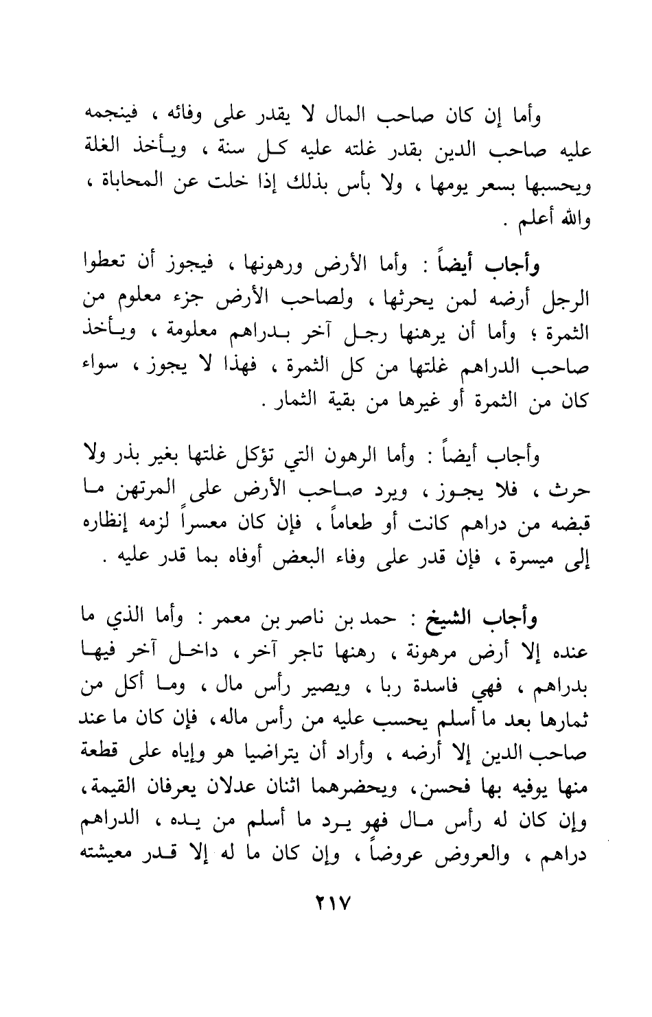 وأجاب الشيخ: حمد بن ناصر بن معمر: وأما الذي ما عنده إلا أرض مرهونة، رهنها تاجر آخر، داخل آخر فيها بدراهم، فهي فاسدة ربا، ويصير رأس مال، وما أكل من ثمارها بعد ما أسلم يحسب عليه من رأس ماله، فإن كان ما عند صاحب الدين إلا أرضه، وأراد أن يتراضيا هو وإياه على قطعة منها يوفيه بها فحسن، ويحضرهما اثنان عدلان يعرفان القيمة، إن كان له رأس مال فهو يرد ما أسلم من يده، الدراهم دراهم، والعروض عروضا، وإن كان ما له إلا قدر معيشته