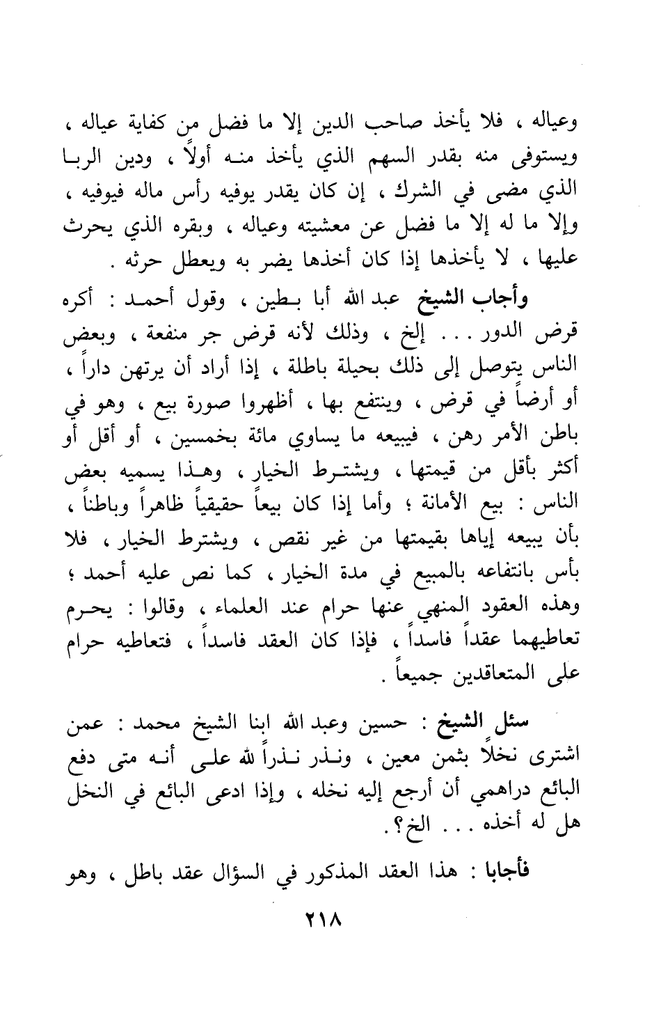 وأجاب الشيخ عبد الله أبا بطين، وقول أحمد: أكره قرض الدور ... إلخ، وذلك لأنه قرض جر منفعة، وبعض الناس يتوصل إلى ذلك بحيلة باطلة، إذا أراد أن يرتهن دارا، أو أرضا في قرض، وينتفع بها، أظهروا صورة بيع، وهو في باطن الأمر رهن، فيبيعه ما يساوي مائة بخمسين، أو أقل أو أكثر بأقل من قيمتها، ويشترط الخيار، وهذا يسميه بعض الناس: بيع الأمانة، وأما إذا كان بيعا حقيقيا ظاهرا وباطنا، بأن يبيعه إياها بقيمتها من غير نقص، ويشترط الخيار، فلا بأس بانتفاعه بالمبيع في مدة الخيار، كما نص عليه أحمد ; وهذه العقود المنهي عنها حرام عند العلماء، وقالوا: يحرم تعاطيهما عقدا فاسدا، فإذا كان العقد فاسدا، فتعاطيه حرام على المتعاقدين جميعا.