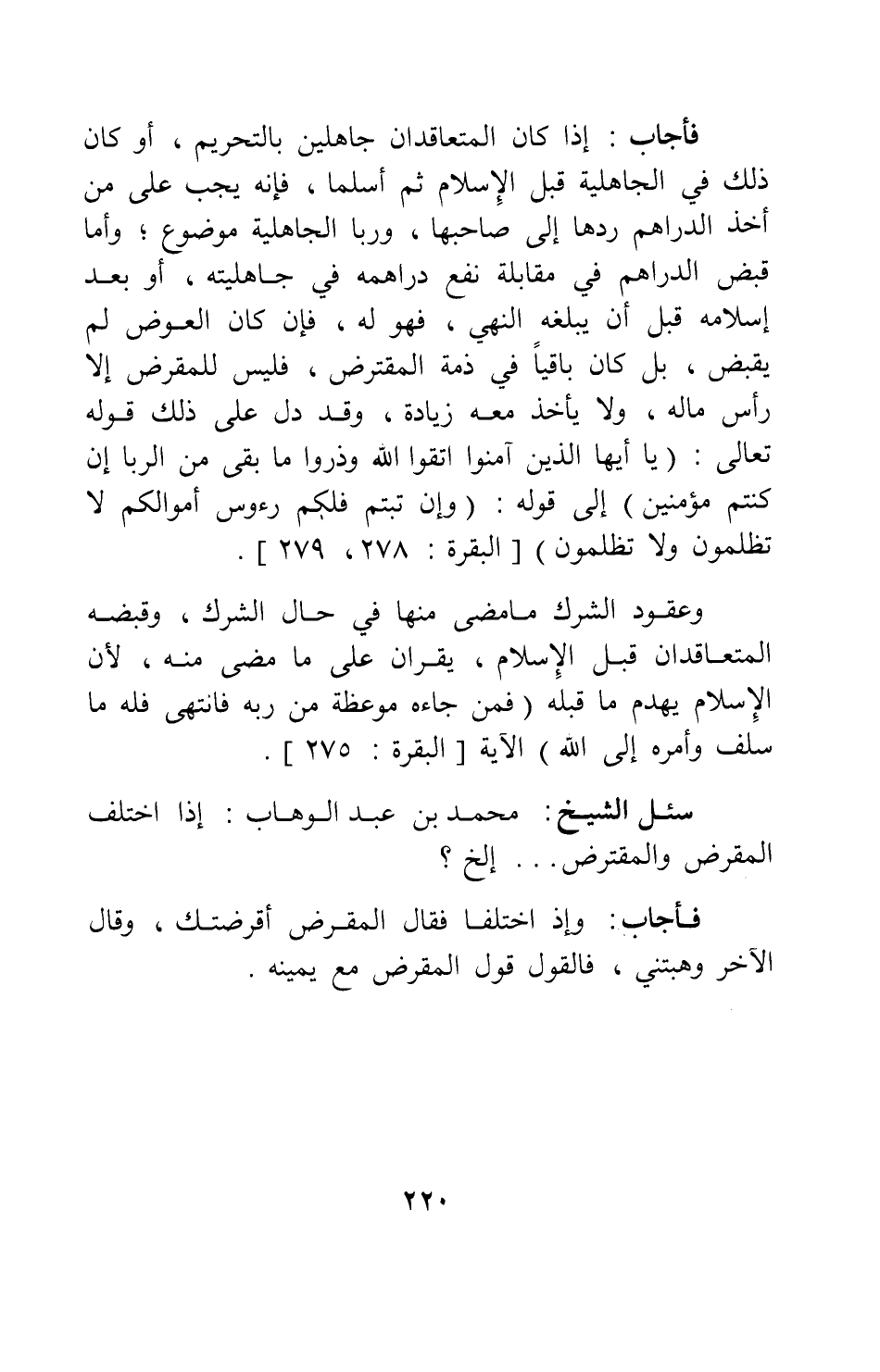 فأجاب: إذا كان المتعاقدان جاهلين بالتحريم، أو كان ذلك في الجاهلية قبل الإسلام ثم أسلما، فإنه يجب على من أخذ الدراهم ردها إلى صاحبها، وربا الجاهلية موضوع ; وأما قبض الدراهم في مقابلة نفع دراهمه في جاهليته، أو بعد إسلامه قبل أن يبلغه النهي، فهو له، فإن كان العوض لم يقبض، بل كان باقيا في ذمة المقترض، فليس للمقرض إلا رأس ماله، ولا يأخذ معه زيادة، وقد دل على ذلك قوله تعالى: {يَا أَيُّهَا الَّذِينَ آمَنُوا اتَّقُوا اللَّهَ وَذَرُوا مَا بَقِيَ مِنَ الرِّبا إِنْ كُنْتُمْ مُؤْمِنِينَ} [سورة البقرة آية: 278] إلى قوله: {وَإِنْ تُبْتُمْ فَلَكُمْ رُؤُوسُ أَمْوَالِكُمْ لا تَظْلِمُونَ وَلا تُظْلَمُونَ} [سورة البقرة آية: 279] وعقود الشرك ما مضى منها في حال الشرك، وقبضه المتعاقدان قبل الإسلام، يقران على ما مضى منه ; لأن الإسلام يهدم ما قبله {فَمَنْ جَاءَهُ مَوْعِظَةٌ مِنْ رَبِّهِ فَانْتَهَى فَلَهُ مَا سَلَفَ وَأَمْرُهُ إِلَى اللَّهِ} الآية [سورة البقرة آية: 275] .