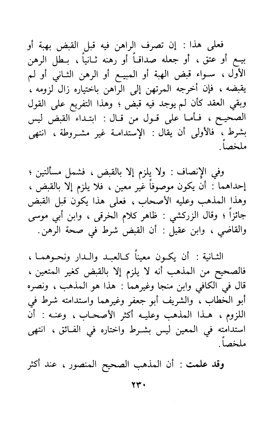 الثانية: أن يكون معينا كالعبد والدار ونحوهما، فالصحيح من المذهب أنه لا يلزم إلا بالقبض كغير المتعين، قال في الكافي وابن منجا وغيرهما: هذا هو المذهب، ونصره أبو الخطاب، والشريف أبو جعفر وغيرهما واستدامته شرط في اللزوم، هذا المذهب وعليه أكثر الأصحاب، وعنه: أن استدامته في المعين ليس بشرط واختاره في الفائق، انتهى ملخصا.