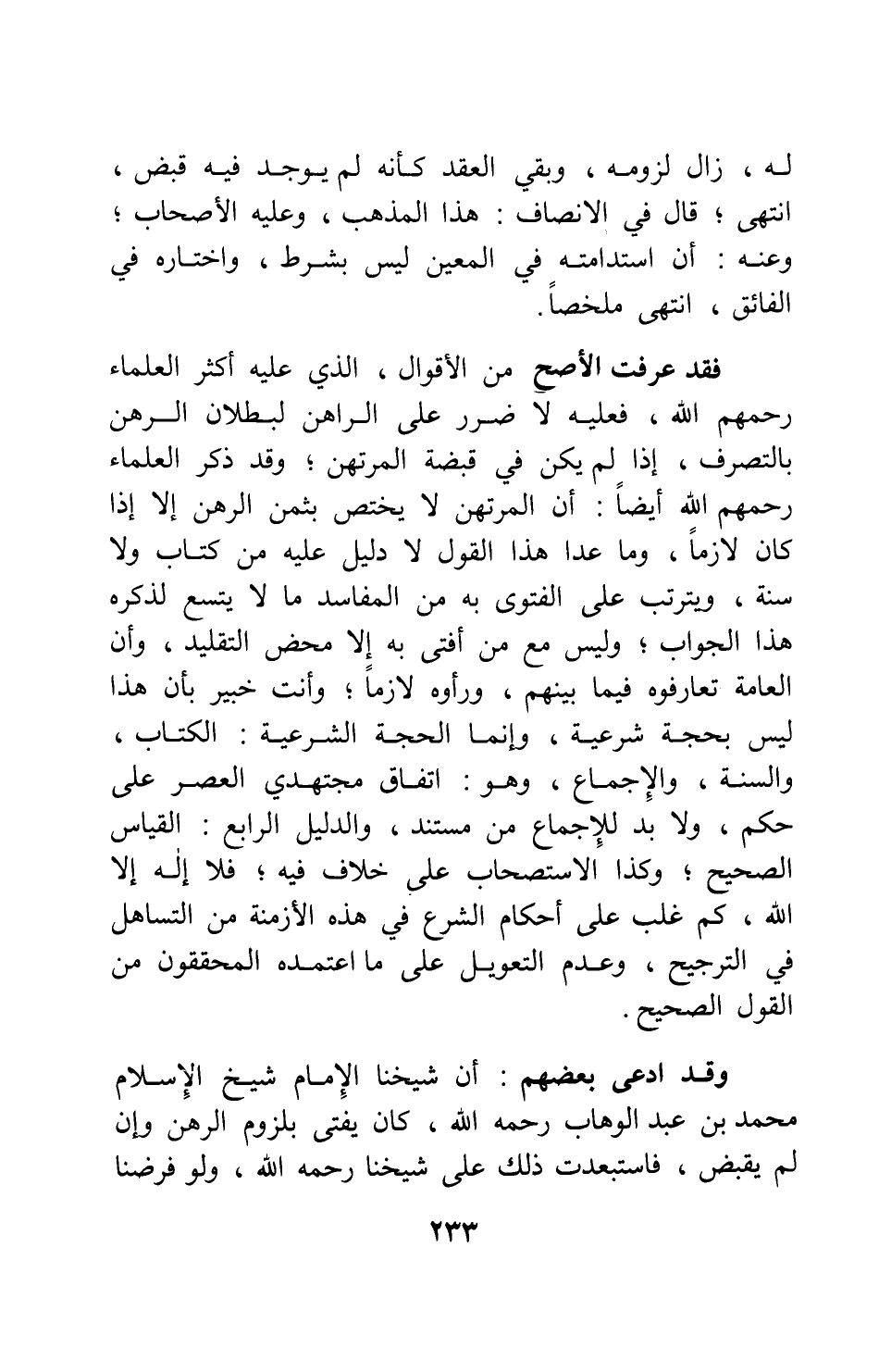 وقد ادعى بعضهم: أن شيخنا الإمام شيخ الإسلام محمد بن عبد الوهاب رحمه الله، كان يفتي بلزوم الرهن وإن لم يقبض، فاستبعدت ذلك على شيخنا رحمه الله، ولو فرضنا