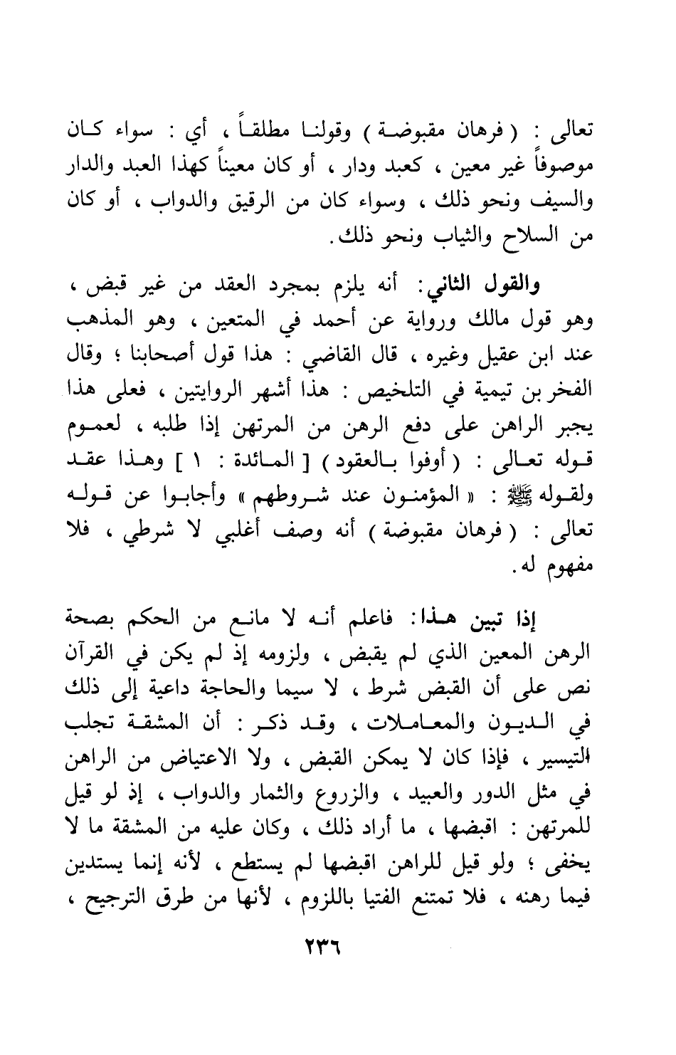 والقول الثاني: أنه يلزم بمجرد العقد من غير قبض، وهو قول مالك ورواية عن أحمد في المتعين، وهو المذهب عند ابن عقيل وغيره، قال القاضي: هذا قول أصحابنا ; وقال الفخر بن تيمية في التلخيص: هذا أشهر الروايتين، فعلى هذا يجبر الراهن على دفع الرهن من المرتهن إذا طلبه، لعموم قوله تعالى: {أَوْفُوا بِالْعُقُودِ} [سورة المائدة آية: 1] وهذا عقد ولقوله صلى الله عليه وسلم " المؤمنون عند شروطهم " وأجابوا عن قوله تعالى: {فَرِهَانٌ مَقْبُوضَةٌ} [سورة البقرة آية: 283] أنه وصف أغلبي لا شرطي، فلا مفهوم له.