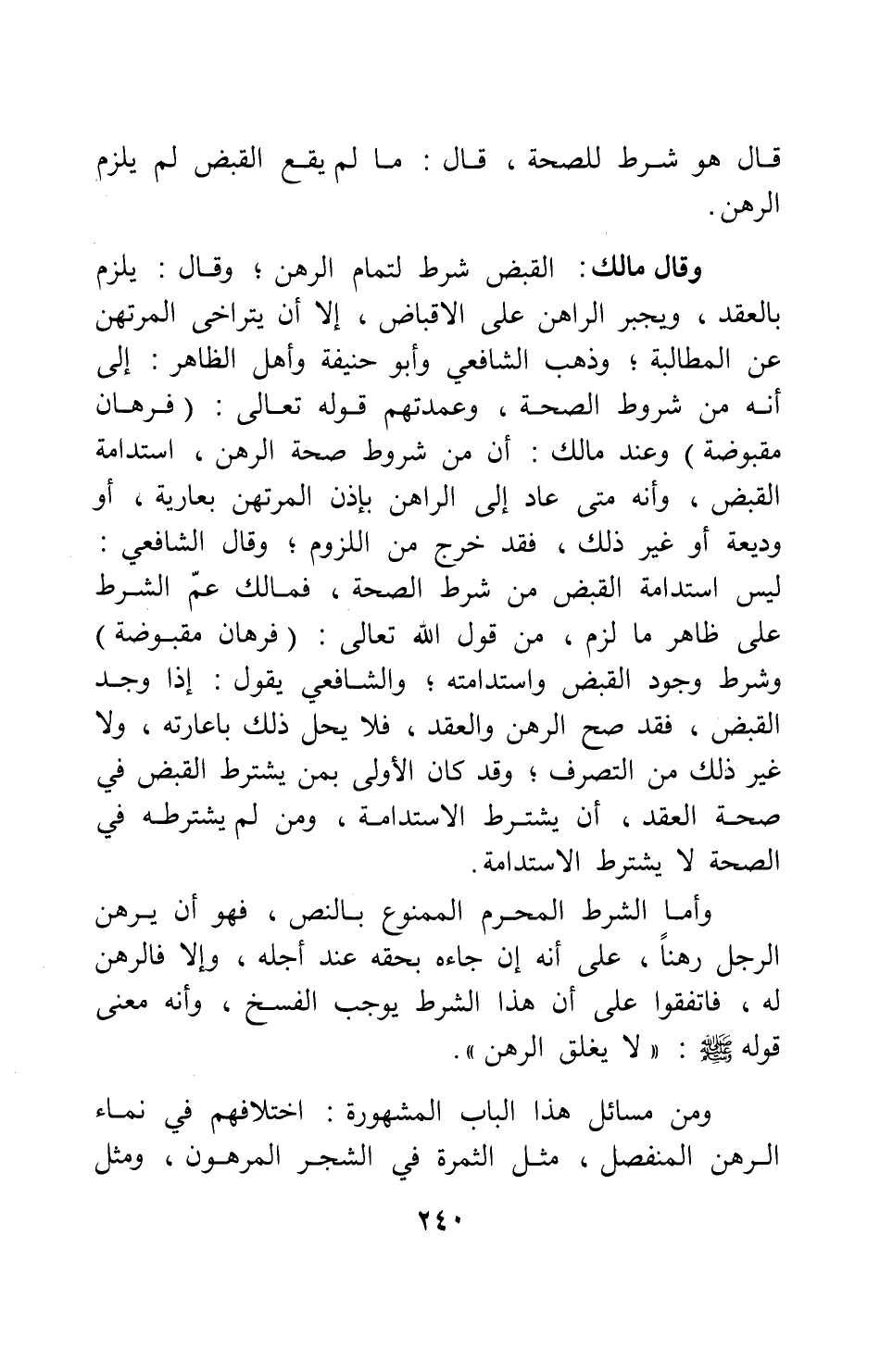 وقال مالك: القبض شرط لتمام الرهن، وقال: يلزم بالعقد، ويجبر الراهن على الإقباض، إلا أن يتراخى المرتهن عن المطالبة، وذهب الشافعي وأبو حنيفة وأهل الظاهر: إلى أنه من شروط الصحة، وعمدتهم قوله تعالى: {فَرِهَانٌ مَقْبُوضَةٌ} [سورة البقرة آية: 283] وعند مالك: أن من شروط صحة الرهن، استدامة القبض، وأنه متى عاد إلى الراهن بإذن المرتهن بعارية، أو وديعة أو غير ذلك، فقد خرج من اللزوم ; وقال الشافعي: ليس استدامة القبض من شرط الصحة، فمالك عم الشرط على ظاهر ما لزم، من قول الله تعالى: {فَرِهَانٌ مَقْبُوضَةٌ} [سورة البقرة آية: 283] وشرط وجود القبض واستدامته ; والشافعي يقول: إذا وجد القبض، فقد صح الرهن والعقد، فلا يحل ذلك بإعارته، ولا غير ذلك من التصرف، وقد كان الأولى بمن يشترط القبض في صحة العقد، أن يشترط الاستدامة، ومن لم يشترطه في الصحة لا يشترط الاستدامة.