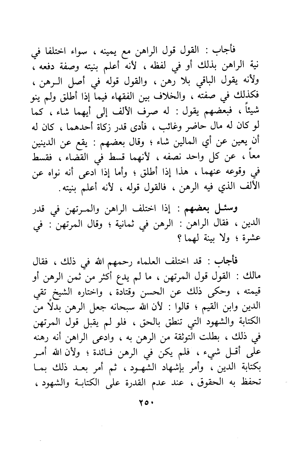 فأجاب: القول قول الراهن مع يمينه، سواء اختلفا في نية الراهن بذلك أو في لفظه ; لأنه أعلم بنيته وصفة دفعه، ولأنه يقول الباقي بلا رهن، والقول قوله في أصل الرهن، فكذلك في صفته، والخلاف بين الفقهاء فيما إذا أطلق ولم ينو شيئا، فبعضهم يقول: له صرف الألف إلى أيهما شاء، كما لو كان له مال حاضر وغائب، فأدى قدر زكاة أحدهما، كان له أن يعين عن أي المالين شاء ; وقال بعضهم: يقع عن الدينين معا، عن كل واحد نصفه، لأنهما قسط في القضاء، فقسط في وقوعه عنهما، هذا إذا أطلق ; وأما إذا ادعى أنه نواه عن الألف الذي فيه الرهن، فالقول قوله، لأنه أعلم بنيته.