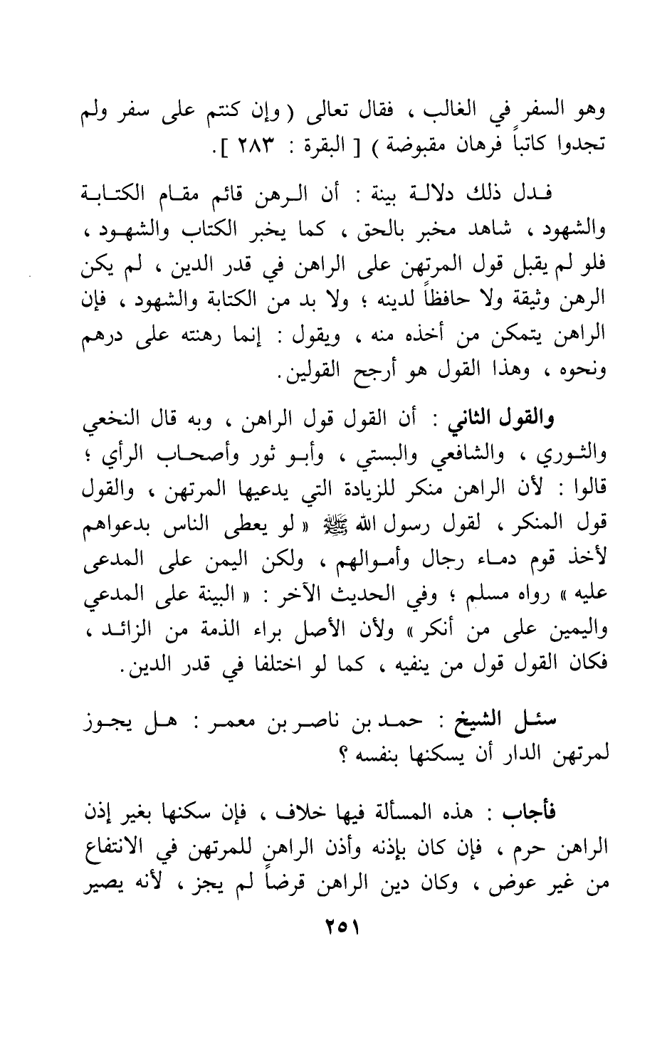 وهو السفر في الغالب، فقال تعالى {وَإِنْ كُنْتُمْ عَلَى سَفَرٍ وَلَمْ تَجِدُوا كَاتِباً فَرِهَانٌ مَقْبُوضَةٌ} [سورة البقرة آية: 283] فدل ذلك دلالة بينة: أن الرهن قائم مقام الكتابة والشهود، شاهد مخبر بالحق، كما يخبر الكتاب والشهود، فلو لم يقبل قول المرتهن على الراهن في قدر الدين، لم يكن الرهن وثيقة ولا حافظا لدينه ; ولا بد من الكتابة والشهود، فإن الراهن يتمكن من أخذه منه، ويقول: إنما رهنته على درهم ونحوه، وهذا القول هو أرجح القولين.