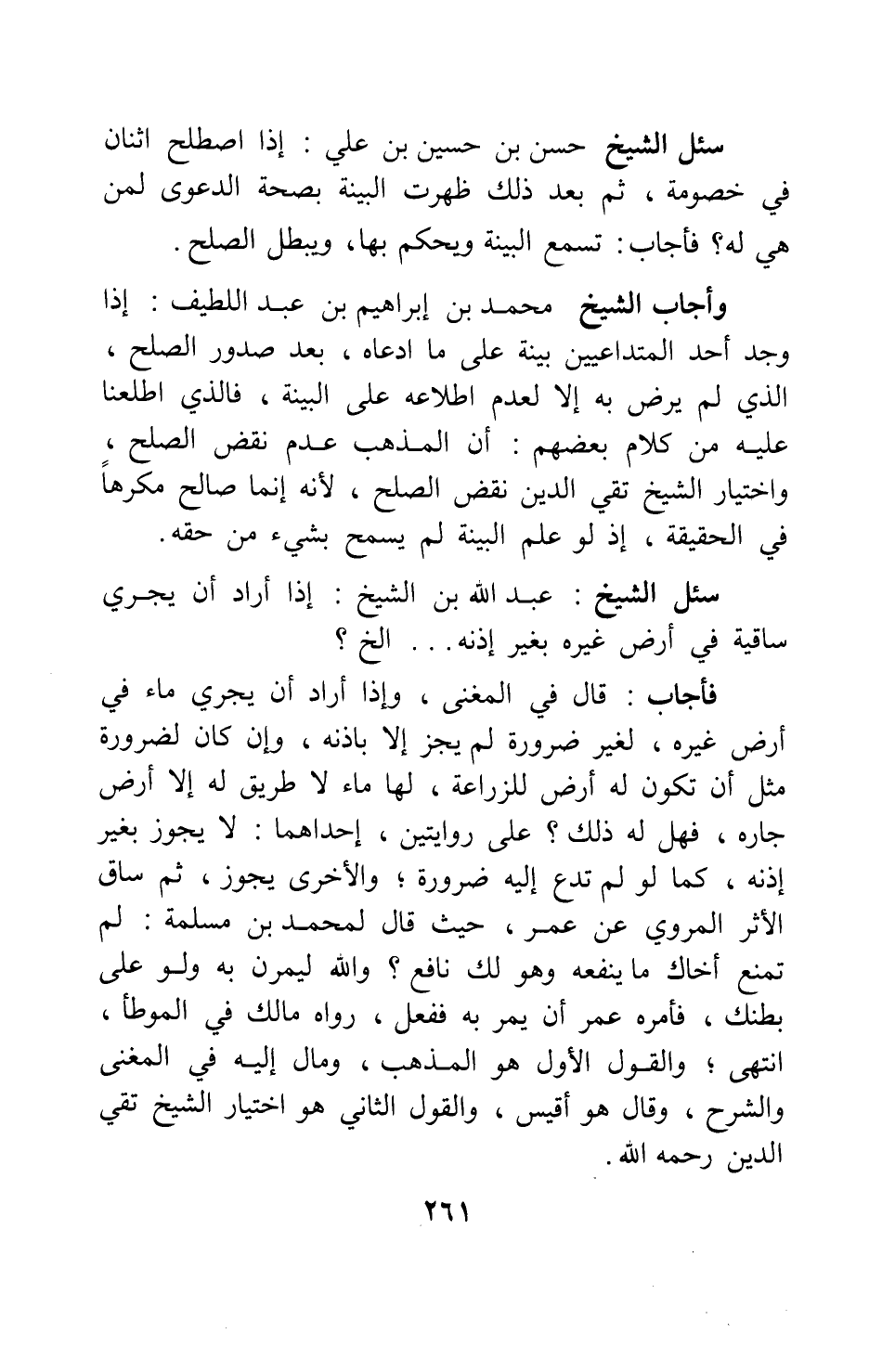 وأجاب الشيخ محمد بن إبراهيم بن عبد اللطيف: إذا وجد أحد المتداعيين بينة على ما ادعاه، بعد صدور الصلح الذى لم يرض به إلا لعدم اطلاعه على البينة، فالذي اطلعنا عليه من كلام بعضهم: أن المذهب عدم نقض الصلح، واختيار الشيخ تقي الدين نقض الصلح ; لأنه إنما صالح مكرها في الحقيقة، إذ لو علم البينة لم يسمح بشيء من حقه.