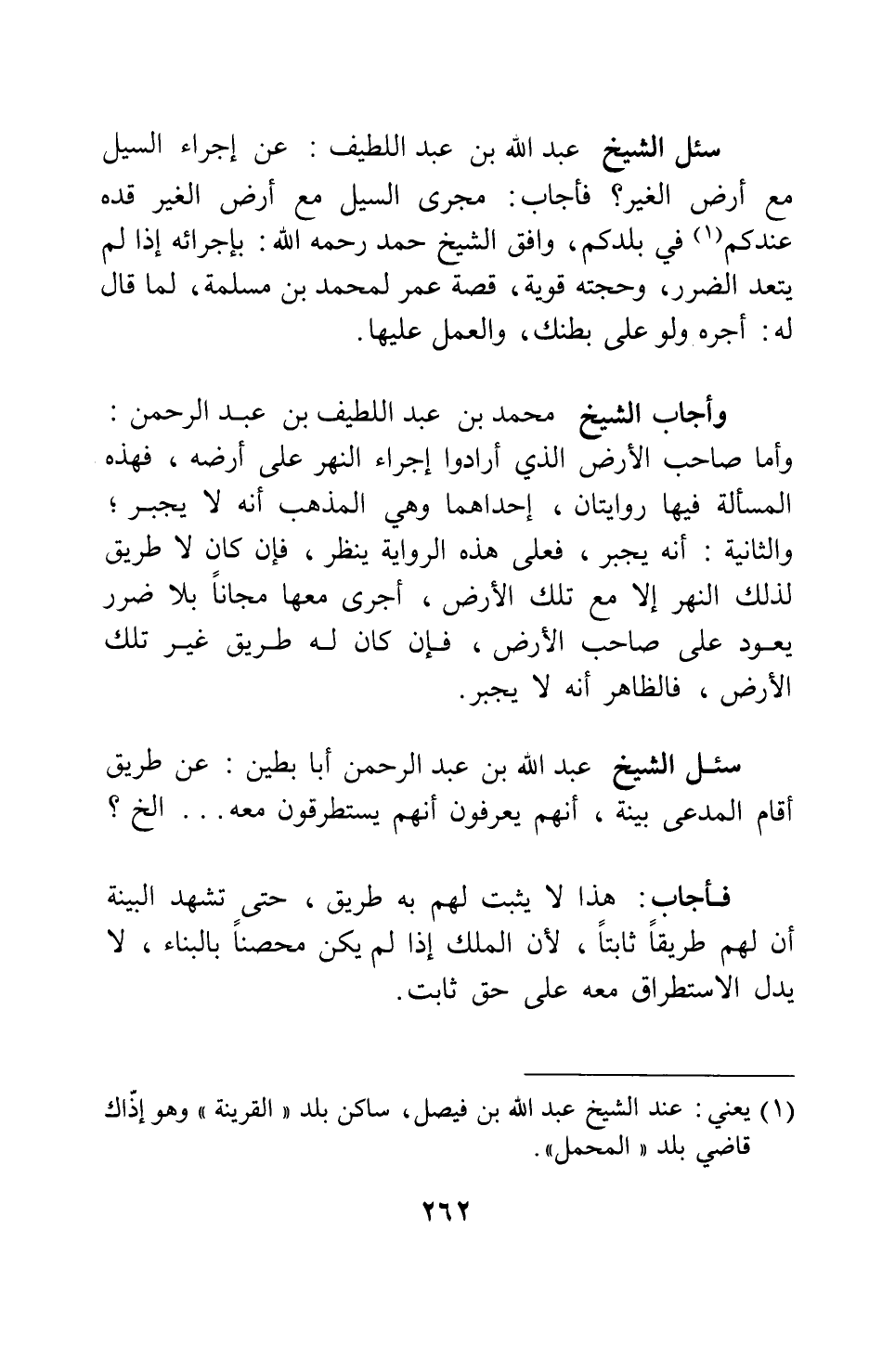 فأجاب: مجرى السيل مع أرض الغير قده عندكم 1 في بلدكم، وافق الشيخ حمد رحمه الله: بإجرائه إذا لم يتعد الضرر، وحجته قوية، قصة عمر لمحمد بن مسلمة، لما قال له: أجره ولو على بطنك، والعمل عليها.