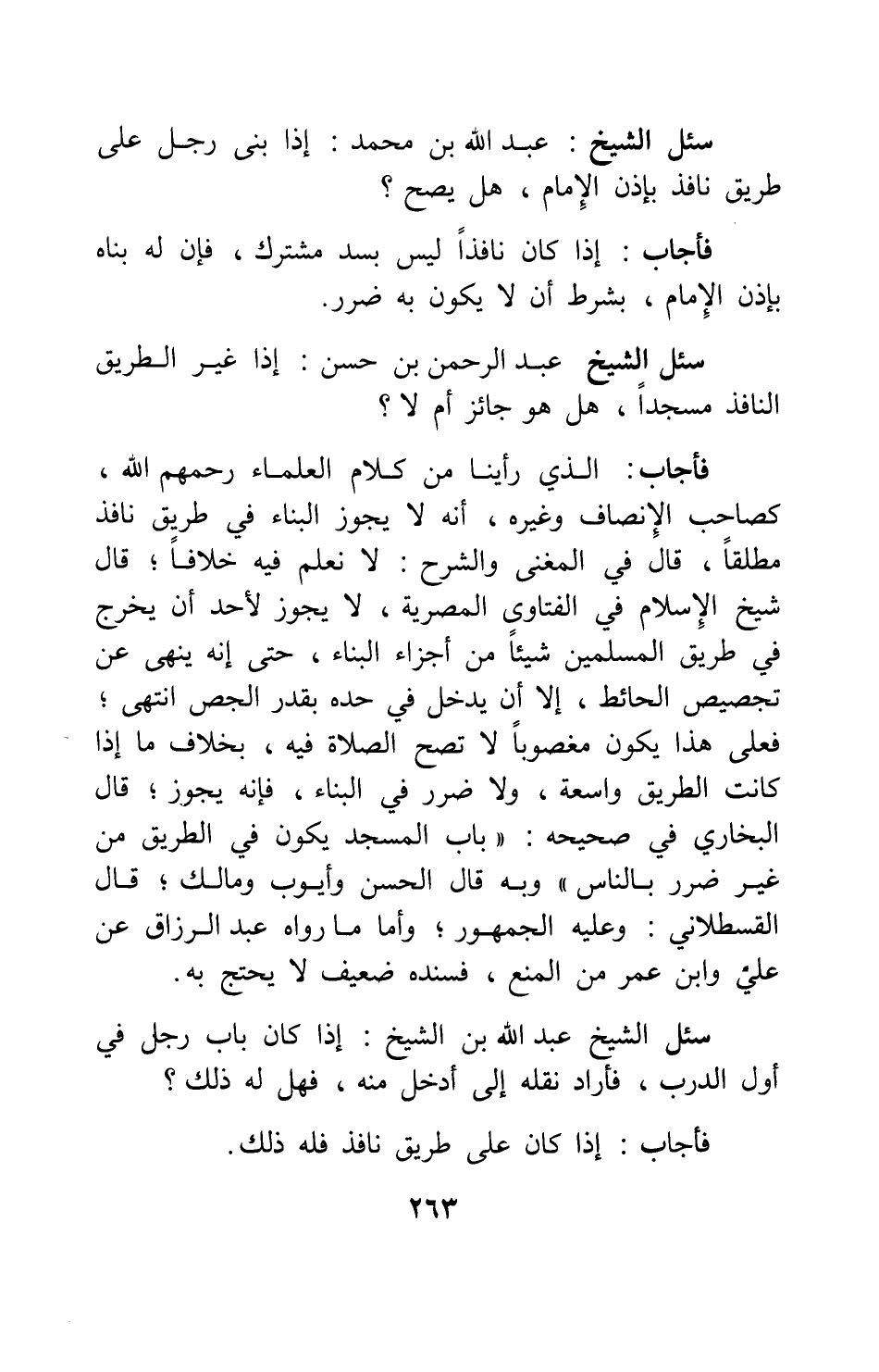 سئل الشيخ عبد الرحمن بن حسن: إذا غير الطريق النافذ مسجدا، هل هو جائز أم لا؟