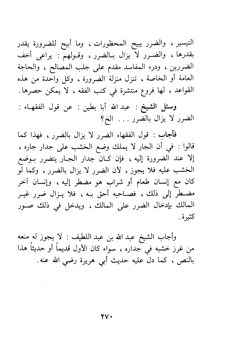 وسئل الشيخ: عبد الله أبا بطين: عن قول الفقهاء: الضرر لا يزال بالضرر ... الخ؟