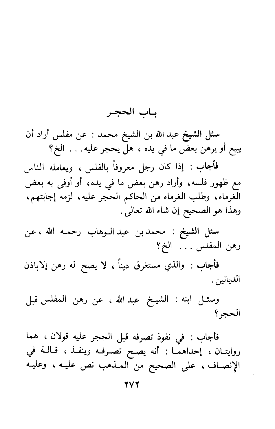 سئل الشيخ عبد الله بن الشيخ محمد: عن مفلس أراد أن يبيع أو يرهن بعض ما في يده، هل يحجر عليه ... الخ؟