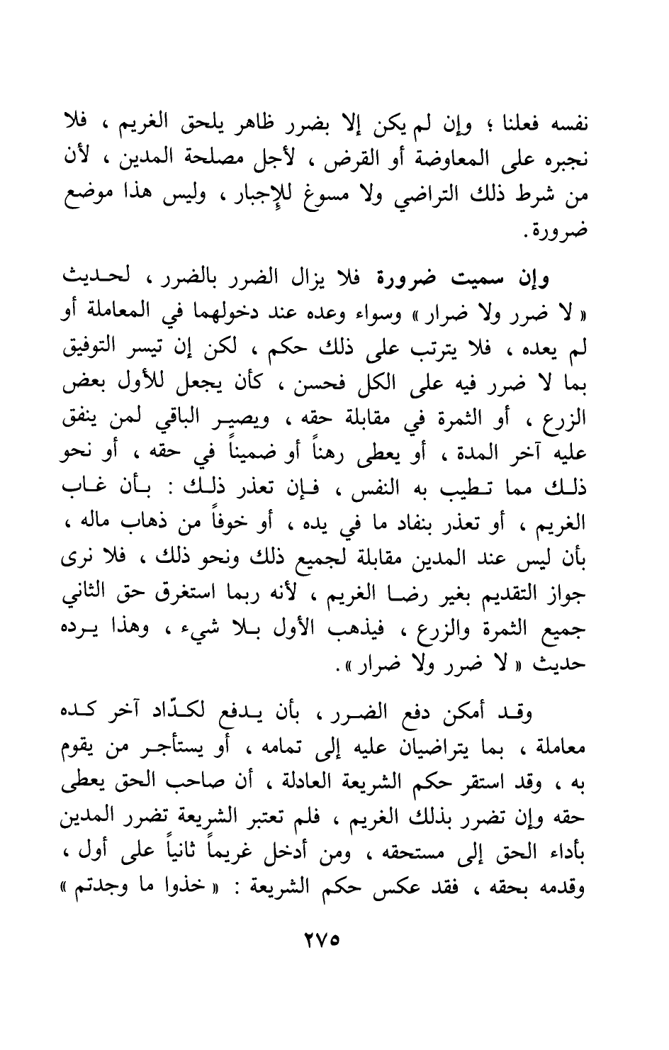 وإن سميت ضرورة فلا يزال الضرر بالضرر، لحديث " لا ضرر ولا ضرار" 1 وسواء وعده عند دخولهما في المعاملة أو لم يعده، فلا يترتب على ذلك حكم، لكن إن تيسر التوفيق بما لا ضرر فيه على الكل فحسن، كأن يجعل للأول بعض الزرع، أو الثمرة في مقابلة حقه، ويصير الباقي لمن ينفق عليه آخر المدة، أو يعطى رهنا أو ضمينا في حقه، أو نحو ذلك مما تطيب به النفس، فإن تعذر ذلك: بأن غاب الغريم، أو تعذر بنفاد ما في يده، أو خوفا من ذهاب ماله، بأن ليس عند المدين مقابلة لجميع ذلك ونحو ذلك، فلا نرى جواز التقديم بغير رضا الغريم ; لأنه ربما استغرق حق الثاني جميع الثمرة والزرع، فيذهب الأول بلا شيء، وهذا يرده حديث "لا ضرر ولا ضرار " 2.