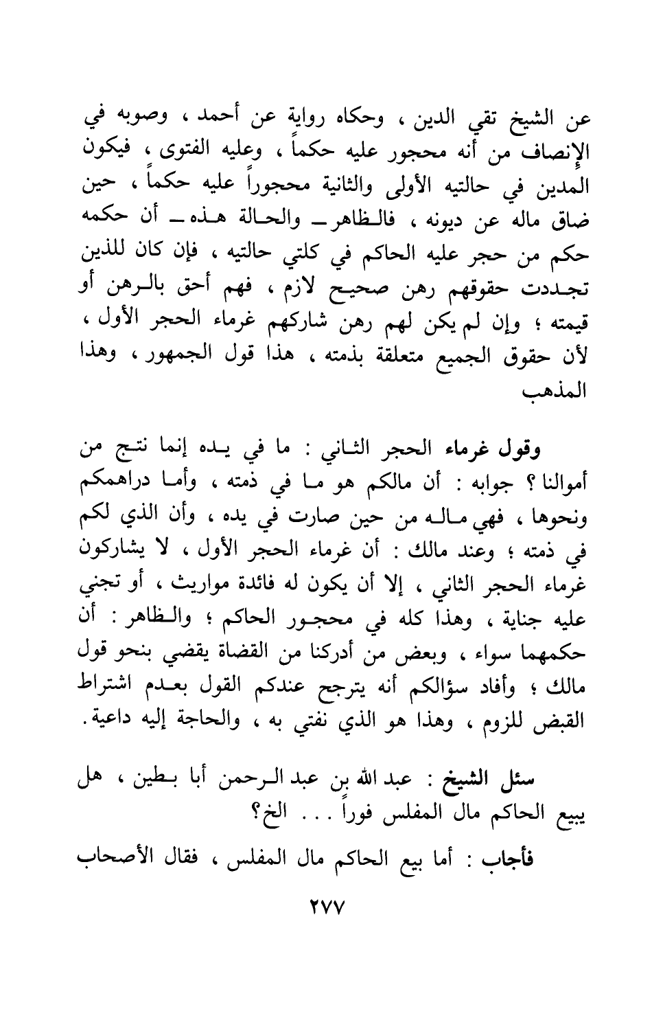 وقول غرماء الحجر الثاني: ما في يده إنما نتج من أموالنا؟ جوابه: أن مالكم هو ما في ذمته، وأما دراهمكم ونحوها، فهي ماله من حين صارت في يده، وأن الذي لكم في ذمته ; وعند مالك: أن غرماء الحجر الأول، لا يشاركون غرماء الحجر الثاني، إلا أن يكون له فائدة مواريث، أو تجني عليه جناية، وهذا كله في محجور الحاكم ; والظاهر: أن حكمهما سواء، وبعض من أدركنا من القضاة يقضي بنحو قول مالك ; وأفاد سؤالكم أنه يترجح عندكم القول بعدم اشتراط القبض للزوم، وهذا هو الذي نفتي به، والحاجة إليه داعية.