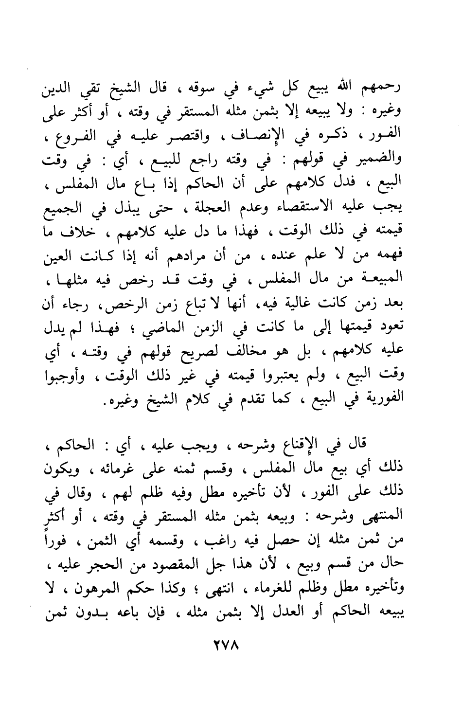 رحمهم الله يبيع كل شيء في سوقه، قال الشيخ تقي الدين وغيره: ولا يبيعه إلا بثمن مثله المستقر في وقته، أو أكثر على الفور، ذكره في الإنصاف، واقتصر عليه في الفروع، والضمير في قولهم: في وقته راجع للبيع، أي: في وقت البيع، فدل كلامهم على أن الحاكم إذا باع مال المفلس، يجب عليه الاستقصاء وعدم العجلة، حتى يبذل في الجميع قيمته في ذلك الوقت، فهذا ما دل عليه كلامهم، خلاف ما فهمه من لا علم عنده، من أن مرادهم أنه إذا كانت العين المبيعة من مال المفلس، في وقت قد رخص فيه مثلها، بعد زمن كانت غالية فيه، أنها لا تباع زمن الرخص، رجاء أن تعود قيمتها إلى ما كانت في الزمن الماضي ; فهذا لم يدل عليه كلامهم، بل هو مخالف لصريح قولهم في وقته، أي وقت البيع، ولم يعتبروا قيمته في غير ذلك الوقت، وأوجبوا الفورية في البيع، كما تقدم في كلام الشيخ وغيره.