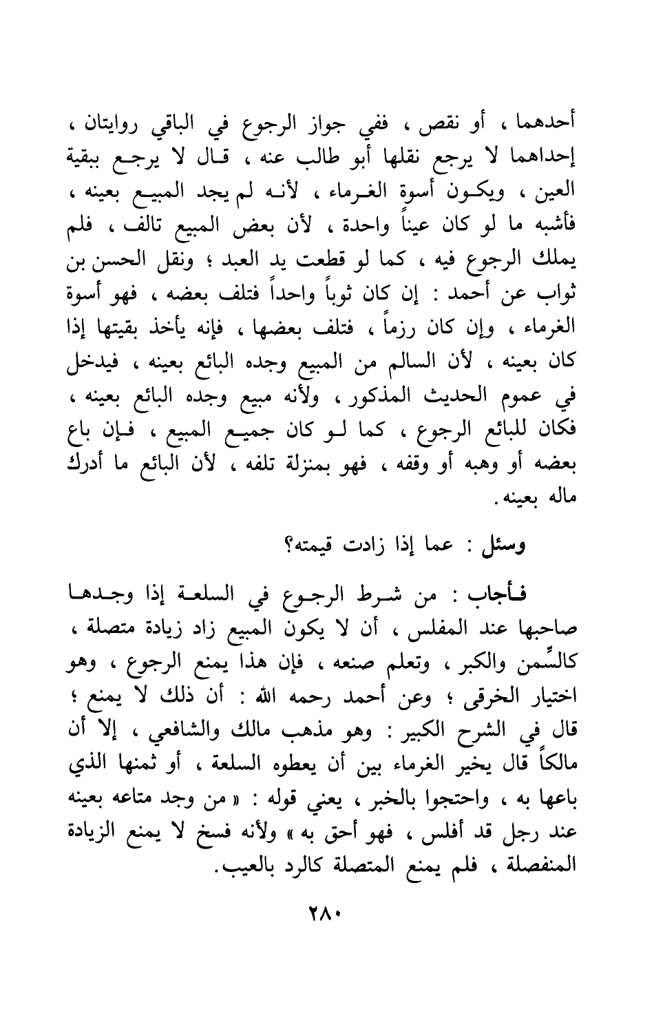 فأجاب: من شرط الرجوع في السلعة إذا وجدها صاحبها عند المفلس، أن لا يكون المبيع زاد زيادة متصلة، كالسمن والكبر، وتعلم صنعه، فإن هذا يمنع الرجوع، وهو اختيار الخرقي ; وعن أحمد رحمه الله: أن ذلك لا يمنع ; قال في الشرح الكبير: وهو مذهب مالك والشافعي، إلا أن مالكا قال يخير الغرماء بين أن يعطوه السلعة، أو ثمنها الذي باعها به، واحتجوا بالخبر، يعني قوله: " من وجد متاعه بعينه عند رجل قد أفلس، فهو أحق به " 1 ولأنه فسخ لا يمنع الزيادة المنفصلة، فلم يمنع المتصلة كالرد بالعيب.