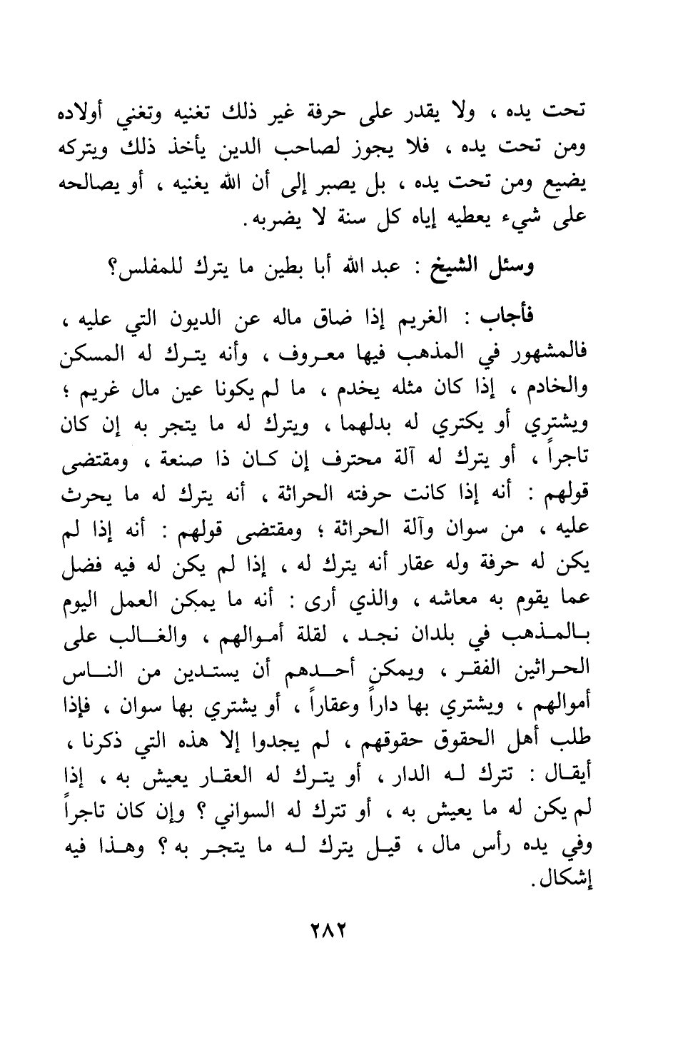 فأجاب: الغريم إذا ضاق ماله عن الديون التي عليه، فالمشهور في المذهب فيها معروف، وأنه يترك له المسكن والخادم، إذا كان مثله يخدم، ما لم يكونا عين مال غريم ; ويشتري أو يكتري له بدلهما، ويترك له ما يتجر به إن كان تاجرا، أو يترك له آلة محترف إن كان ذا صنعة، ومقتضى قولهم: أنه إذا كانت حرفته الحراثة، أنه يترك له ما يحرث عليه، من سوان وآلة الحراثة، ومقتضى قولهم: أنه إذا لم يكن له حرفة وله عقار أنه يترك له، إذا لم يكن له فيه فضل عما يقوم به معاشه، والذي أرى: أنه ما يمكن العمل اليوم بالمذهب في بلدان نجد، لقلة أموالهم، والغالب على الحراثين الفقر، ويمكن أحدهم أن يستدين من الناس أموالهم، ويشتري بها دارا وعقارا، أو يشتري بها سوان، فإذا طلب أهل الحقوق حقوقهم، لم يجدوا إلا هذه التي ذكرنا، أيقال: تترك له الدار، أو يترك له العقار يعيش به، إذا لم يكن له ما يعيش به، أو تترك له السواني؟ وإن كان تاجرا وفي يده رأس مال، قيل يترك له ما يتجر به؟ وهذا فيه إشكال.