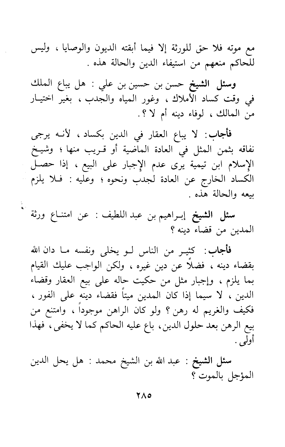 وسئل الشيخ حسن بن حسين بن علي: هل يباع الملك في وقت كساد الأملاك وغور المياه والجدب، بغير اختيار من المالك، لوفاء دينه أم لا؟.