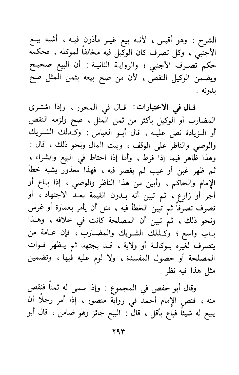 قال في الاختيارات: قال في المحرر، إذا اشترى المضارب أو الوكيل بأكثر من ثمن المثل، صح ولزمه النقص أو الزيادة نص عليه، قال أبو العباس: وكذلك الشريك والوصي والناظر على الوقف، وبيت المال ونحو ذلك، قال وهذا ظاهر فيما إذا فرط، وأما إذا احتاط في البيع والشراء، ثم ظهر غبن أو عيب لم يقصر فيه، فهذا معذور يشبه خطأ الإمام والحاكم، وأبين من هذا الناظر والوصي، إذا باع أو أجر أو زارع، ثم تبين أنه بدون القيمة بعد الاجتهاد، أو تصرف تصرفا ثم تبين الخطأ فيه، مثل أن يأمر بعمارة أو غرس ونحو ذلك، ثم تبين أن المصلحة كانت في خلافه، وهذا باب واسع ; وكذلك الشريك والمضارب، فإن عامة من يتصرف لغيره بوكالة أو ولاية، قد يجتهد ثم يظهر فوات المصلحة أو حصول المفسدة، ولا لوم عليه فيها، وتضمين مثل هذا فيه نظر.