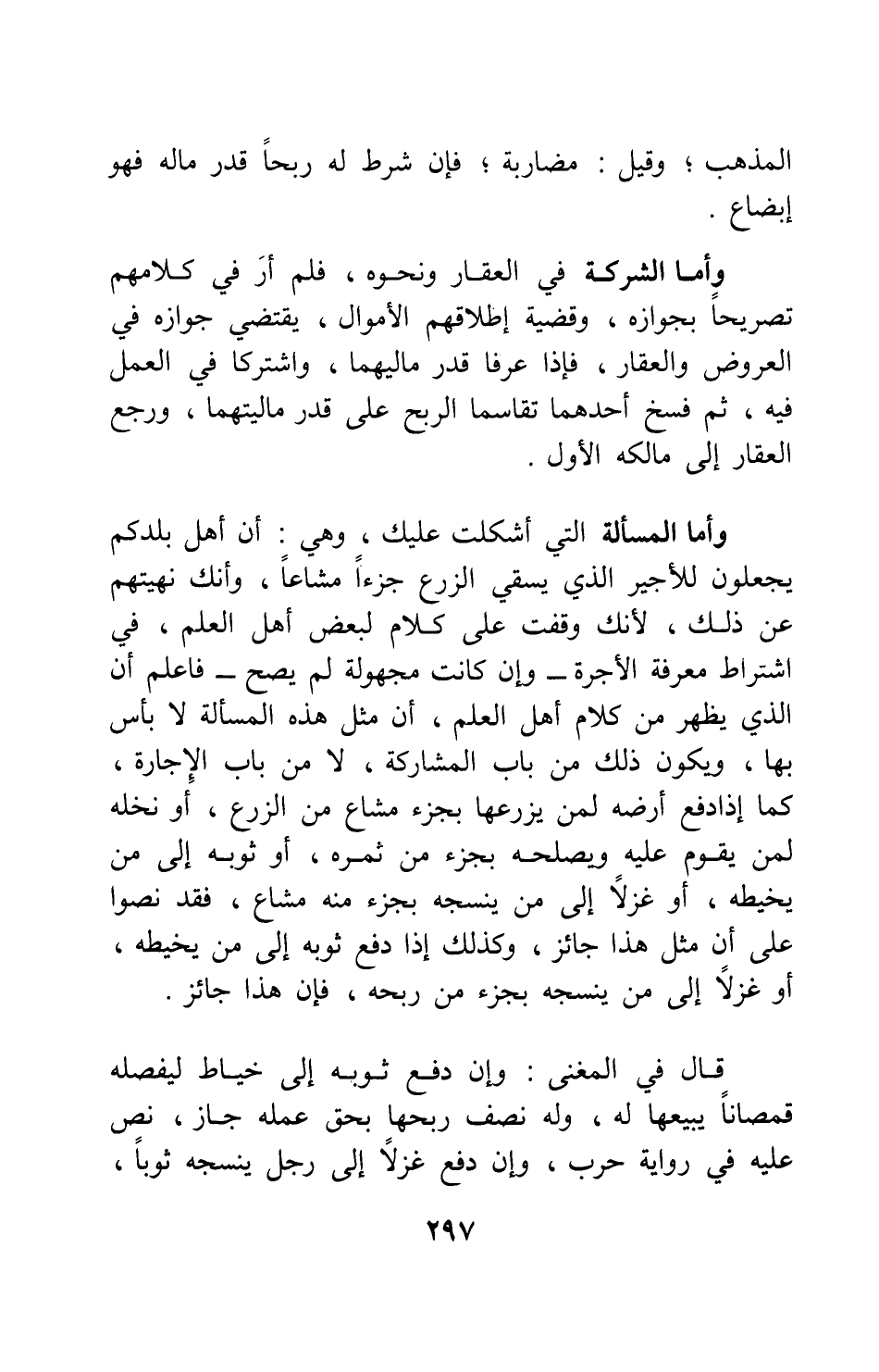 وأما المسألة التي أشكلت عليك، وهي: أن أهل بلدكم يجعلون للأجير الذي يسقي الزرع جزءا مشاعا، وأنك نهيتهم عن ذلك ; لأنك وقفت على كلام لبعض أهل العلم، في اشتراط معرفة الأجرة - وإن كانت مجهولة لم يصح- فاعلم أن الذي يظهر من كلام أهل العلم، أن مثل هذه المسألة لا بأس بها، ويكون ذلك من باب المشاركة، لا من باب الإجارة، كما إذا دفع أرضه لمن يزرعها بجزء مشاع من الزرع، أو نخله لمن يقوم عليه ويصلحه بجزء من ثمره، أو ثوبه إلى من يخيطه، أو غزلا إلى من ينسجه بجزء منه مشاع، فقد نصوا على أن مثل هذا جائز، وكذلك إذا دفع ثوبه إلى من يخيطه، أو غزلا إلى من ينسجه بجزء من ربحه، فإن هذا جائز.