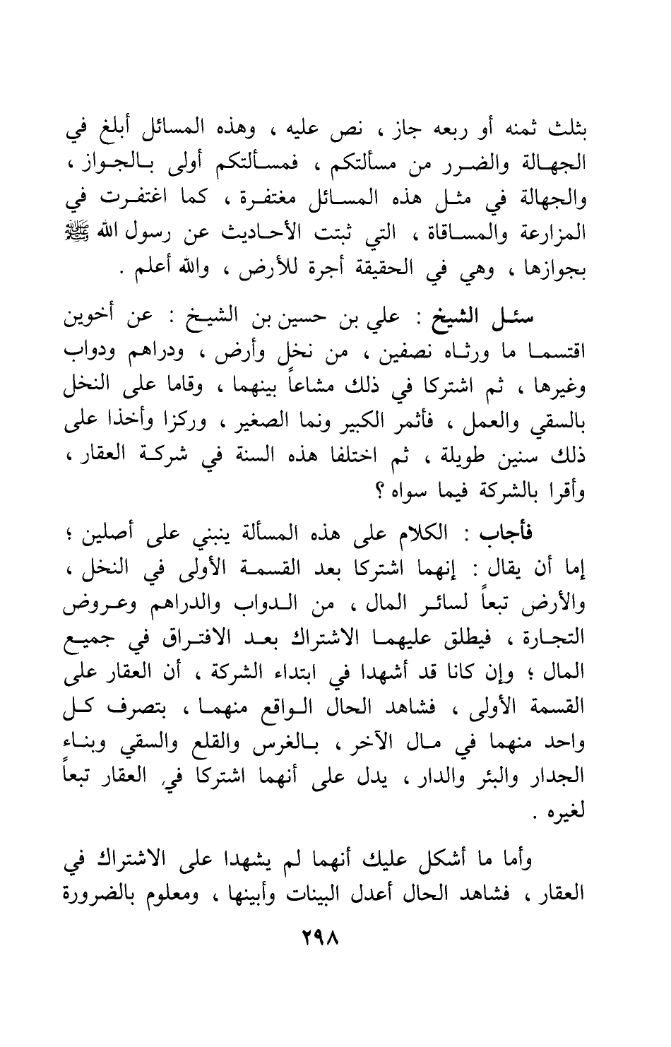 فأجاب: الكلام على هذه المسألة ينبني على أصلين ; إما أن يقال: إنهما اشتركا بعد القسمة الأولى في النخل، والأرض تبعا لسائر المال، من الدواب والدراهم وعروض التجارة، فيطلق عليهما الاشتراك بعد الافتراق في جميع المال، وإن كانا قد أشهدا في ابتداء الشركة، أن العقار على القسمة الأولى، فشاهد الحال الواقع منهما، بتصرف كل واحد منهما في مال الآخر، بالغرس والقلع والسقي وبناء الجدار والبئر والدار، يدل على أنهما اشتركا في العقار تبعا لغيره.