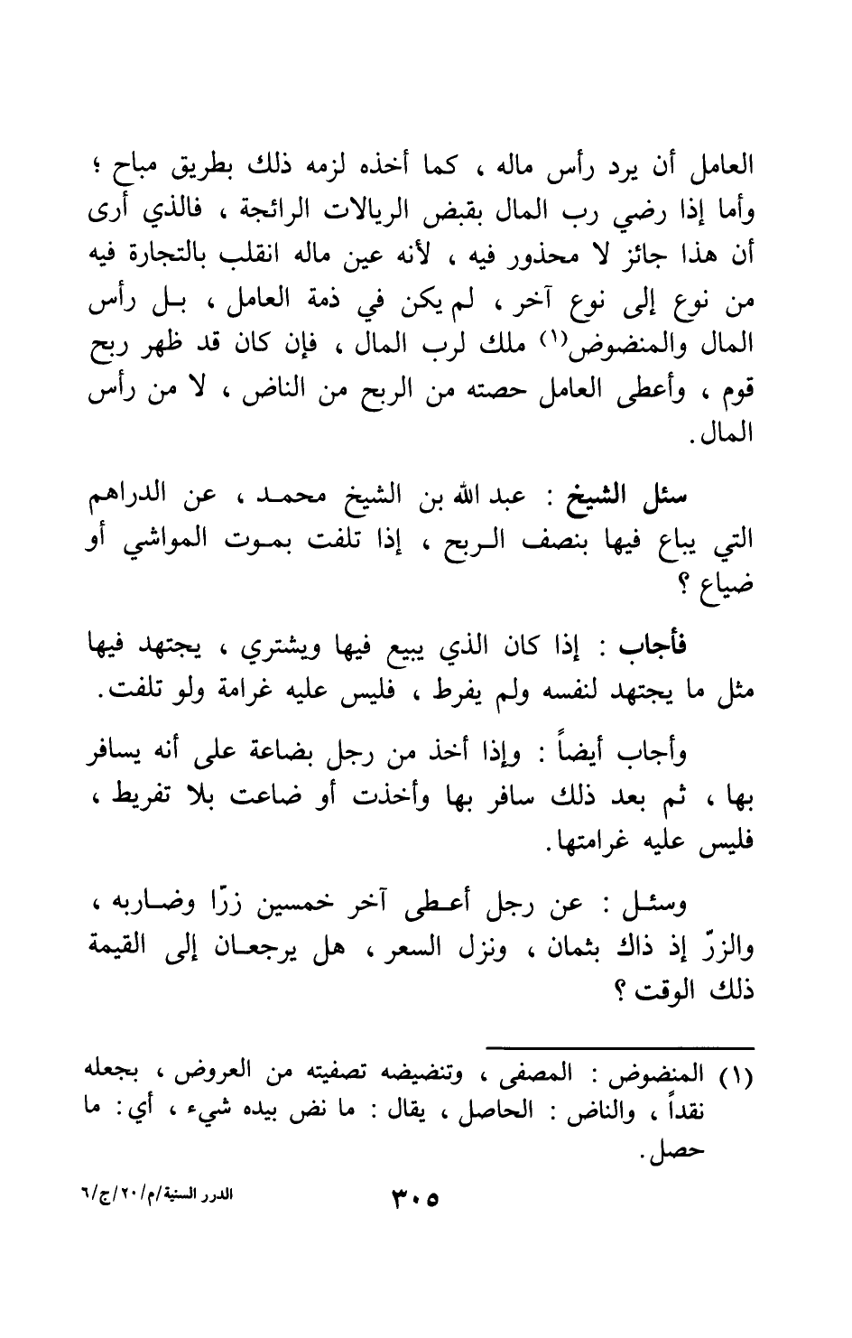 العامل أن يرد رأس ماله، كما أخذه لزمه ذلك بطريق مباح; وأما إذا رضي رب المال بقبض الريالات الرائجة، فالذي أرى أن هذا جائز لا محذور فيه، لأنه عين ماله انقلب بالتجارة فيه من نوع إلى نوع آخر، لم يكن في ذمة العامل، بل رأس المال والمنضوض 1 ملك لرب المال، فإن كان قد ظهر ربح قوم، وأعطى العامل حصته من الربح من الناض، لا من رأس المال.