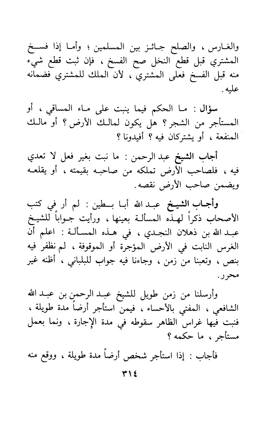 وأجاب الشيخ عبد الله أبا بطين: لم أر في كتب الأصحاب ذكرا لهذه المسألة بعينها، ورأيت جوابا للشيخ عبد الله بن ذهلان النجدي، في هذه المسألة: اعلم أن الغرس النابت في الأرض المؤجرة أو الموقوفة، لم نظفر فيه بنص، وتعبنا من زمن، وجاءنا فيه جواب للبلباني، أظنه غير محرر.
