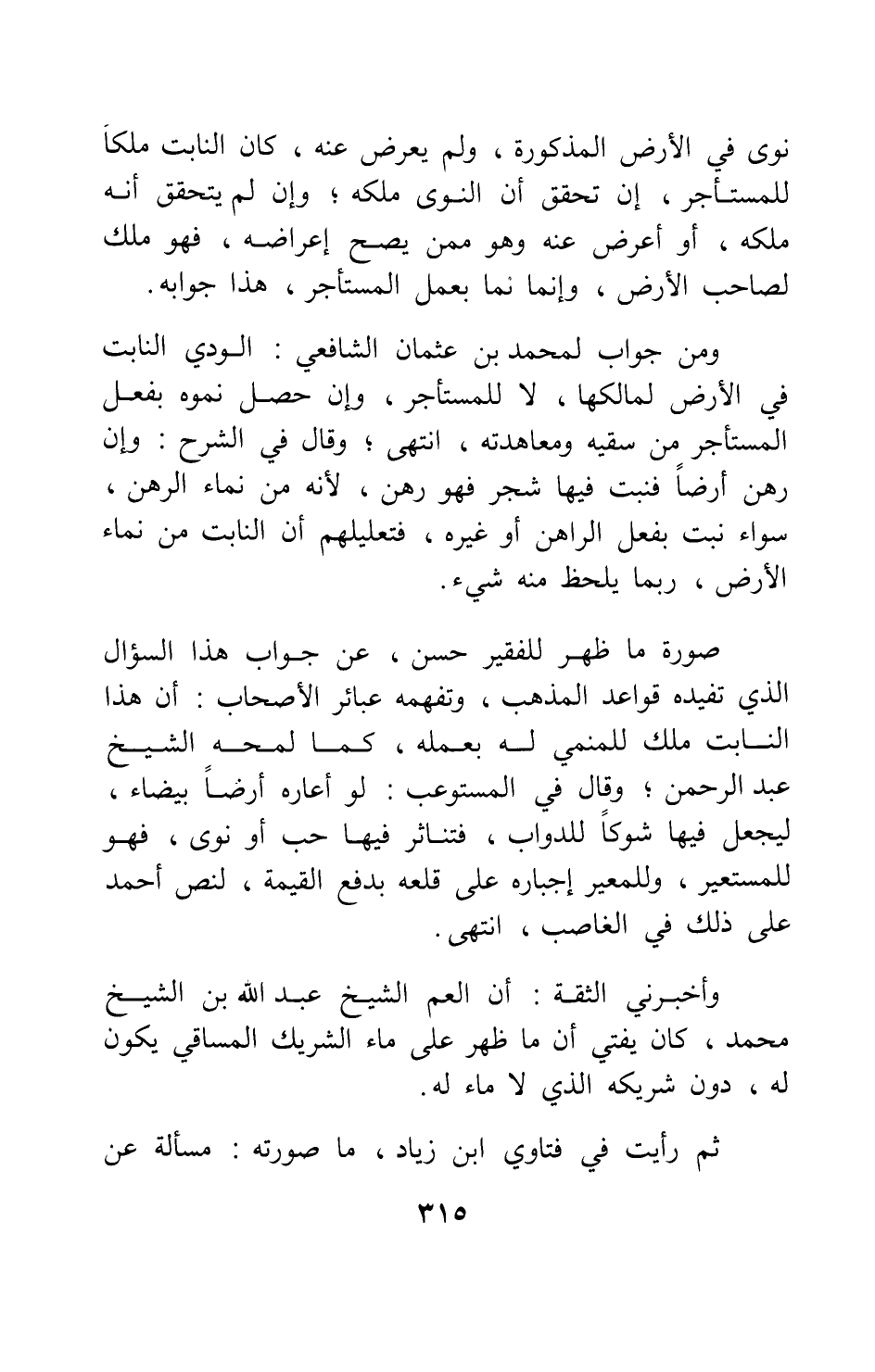 ومن جواب لمحمد بن عثمان الشافعي: الودي النابت في الأرض لمالكها، لا للمستأجر، وإن حصل نموه بفعل المستأجر من سقيه ومعاهدته، انتهى; وقال في الشرح: وإن رهن أرضا فنبت فيها شجر فهو رهن، لأنه من نماء الرهن، سواء نبت بفعل الراهن أو غيره، فتعليلهم أن النابت من نماء الأرض، ربما يلحظ منه شيء صورة ما ظهر للفقير حسن، عن جواب هذا السؤال الذي تفيده قواعد المذهب، وتفهمه عبائر الأصحاب: أن هذا النابت ملك للمنمي له بعمله، كما لمحه الشيخ عبد الرحمن;