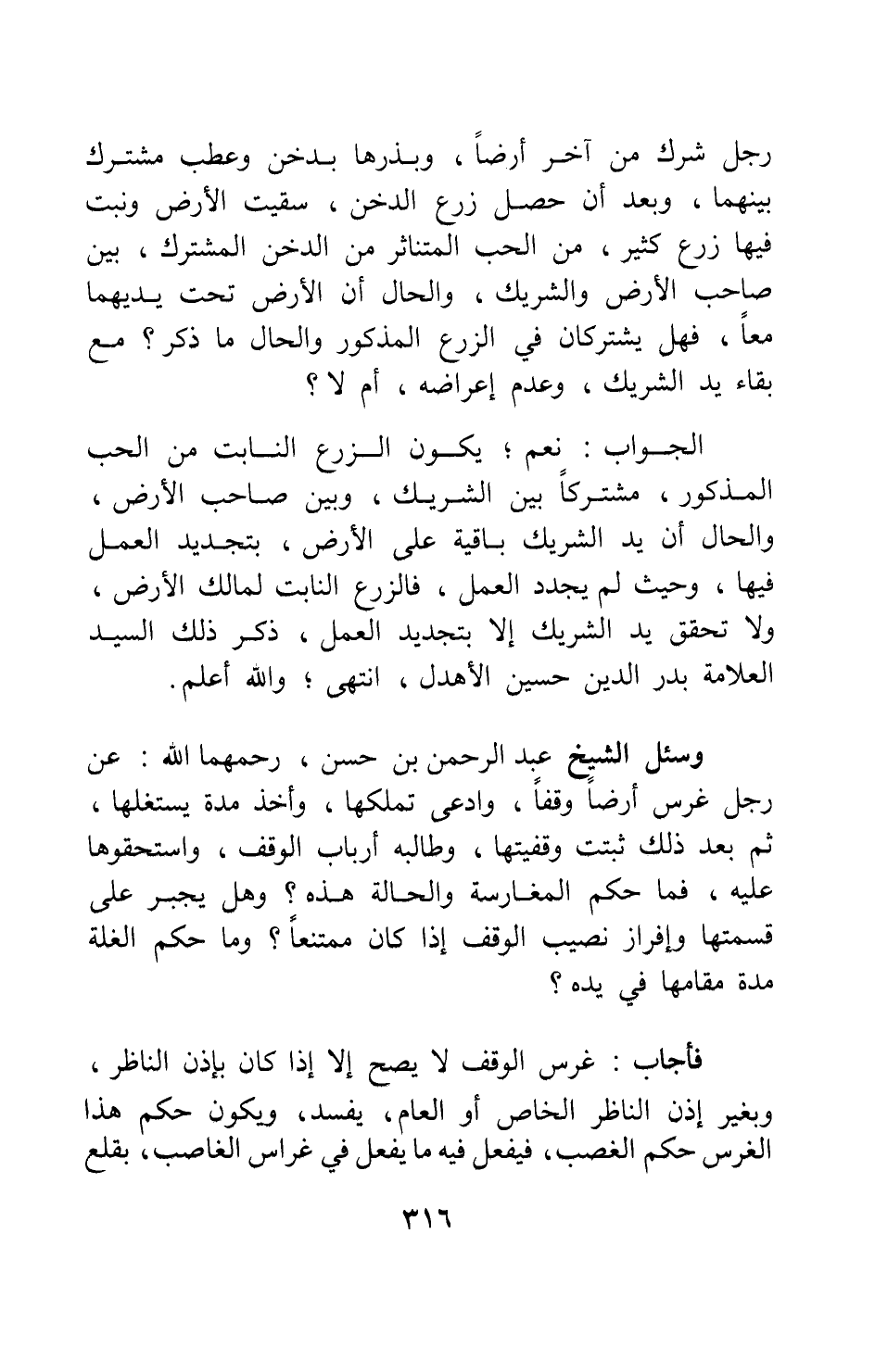 الجواب: نعم; يكون الزرع النابت من الحب المذكور، مشتركا بين الشريك، وبين صاحب الأرض، والحال أن يد الشريك باقية على الأرض، بتجديد العمل فيها، وحيث لم يجدد العمل، فالزرع النابت لمالك الأرض، ولا تحقق يد الشريك إلا بتجديد العمل، ذكر ذلك السيد العلامة بدر الدين حسين الأهدل، انتهى; والله أعلم.