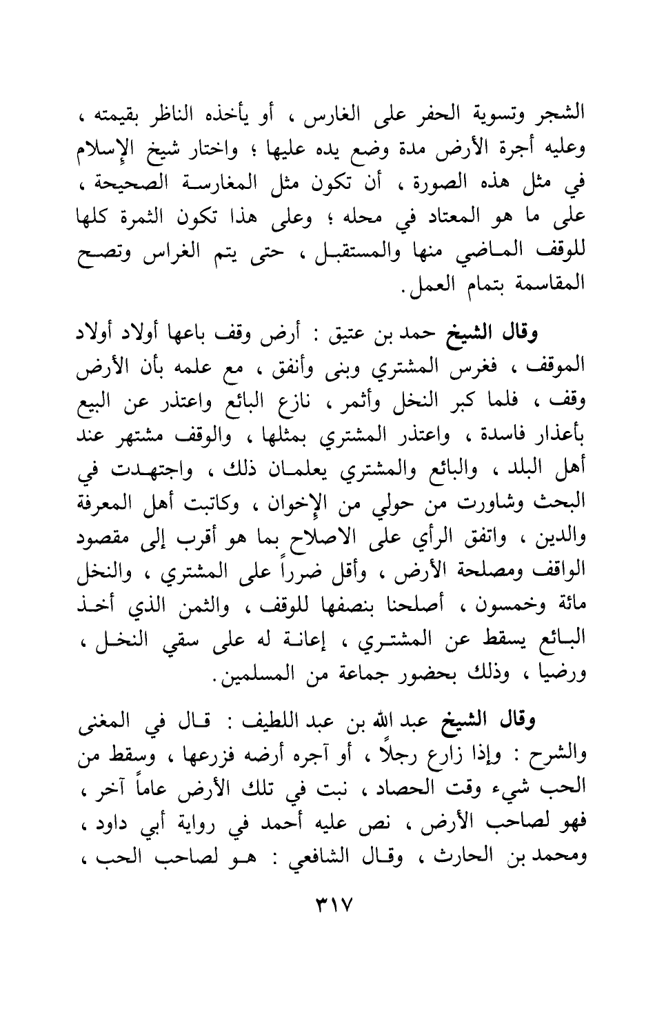 وقال الشيخ حمد بن عتيق: أرض وقف باعها أولاد أولاد الموقف فغرس المشتري وبنى وأنفق، مع علمه بأن الأرض وقف، فلما كبر النخل وأثمر، نازع البائع واعتذر عن البيع بأعذار فاسدة، واعتذر المشتري بمثلها، والوقف مشتهر عند أهل البلد، والبائع والمشتري يعلمان ذلك، واجتهدت في البحث وشاورت من حولي من الإخوان، وكاتبت أهل المعرفة والدين، واتفق الرأي على الإصلاح بما هو أقرب إلى مقصود الواقف ومصلحة الأرض، وأقل ضررا على المشتري، والنخل مائة وخمسون، أصلحنا بنصفها للوقف، والثمن الذي أخذ البائع يسقط عن المشتري، إعانة له على سقي النخل، ورضيا، وذلك بحضور جماعة من المسلمين.