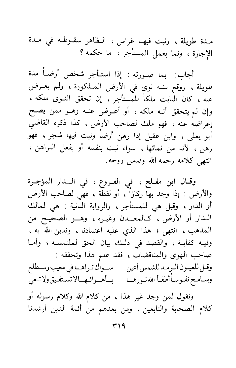 وقال ابن مفلح، في الفروع، في الدار المؤجرة والأرض: إذا وجد بها ركازا، أو لقطة، فهي لصاحب الأرض أو الدار، وقيل هي للمستأجر، والرواية الثانية: هي لمالك الدار أو الأرض، كالمعدن وغيره، وهو الصحيح من المذهب، انتهى، هذا الذي عليه اعتمادنا، وندين الله به، وفيه كفاية، والقصد في ذلك بيان الحق لملتمسه; وأما صاحب الهوى والمناقضات، فقد علم هذا وتحققه: