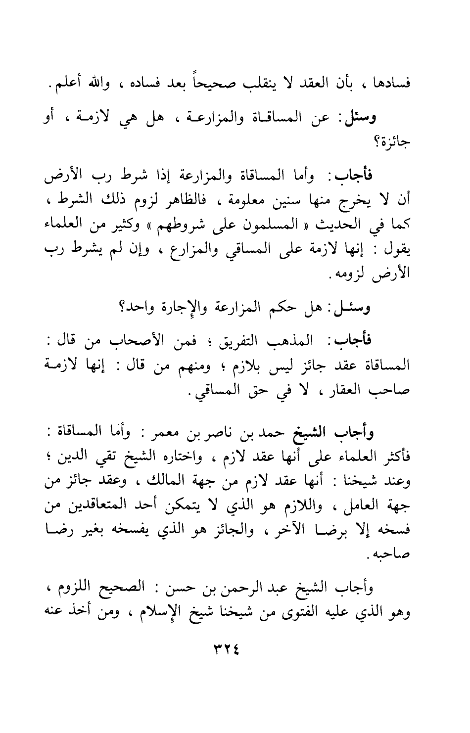 وأجاب الشيخ حمد بن ناصر بن معمر: وأما المساقاة: فأكثر العلماء على أنها عقد لازم، واختاره الشيخ تقي الدين; وعند شيخنا: أنها عقد لازم من جهة المالك، وعقد جائز من جهة العامل، واللازم هو الذي لا يتمكن أحد المتعاقدين من فسخه إلا برضا الآخر، والجائز هو الذي يفسخه بغير رضا صاحبه.