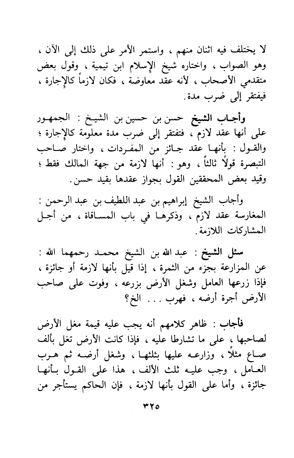 وأجاب الشيخ إبراهيم بن عبد اللطيف بن عبد الرحمن: المغارسة عقد لازم، وذكرها في باب المساقاة، من أجل المشاركات اللازمة.