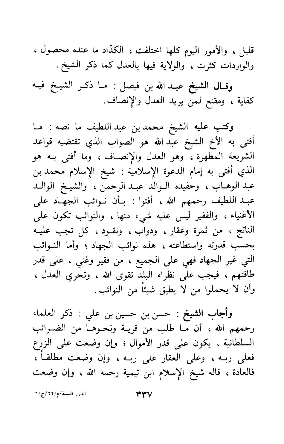 وكتب عليه الشيخ محمد بن عبد اللطيف ما نصه: ما أفتى به الأخ الشيخ عبد الله هو الصواب الذي تقتضيه قواعد الشريعة المطهرة، وهو العدل والإنصاف، وما أفتى به هو الذي أفتى به إمام الدعوة الإسلامية: شيخ الإسلام محمد بن عبد الوهاب، وحفيده الوالد عبد الرحمن، والشيخ الوالد عبد اللطيف رحمهم الله، أفتوا: بأن نوائب الجهاد على الأغنياء، والفقير ليس عليه شيء منها، والنوائب تكون على الناتج، من ثمرة وعقار، ودواب، ونقود، كل تجب عليه بحسب قدرته واستطاعته، هذه نوائب الجهاد، وأما النوائب التي غير الجهاد فهي على الجميع، من فقير وغني، على قدر طاقتهم، فيجب على نظراء البلد تقوى الله، وتحري العدل، وأن لا يحملوا من لا يطيق شيئا من النوائب.