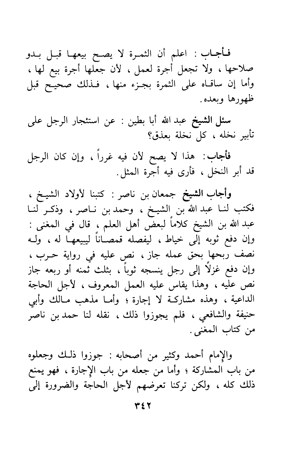 وأجاب الشيخ جمعان بن ناصر: كتبنا لأولاد الشيخ، فكتب لنا عبد الله بن الشيخ، وحمد بن ناصر، وذكر لنا عبد الله بن الشيخ كلاما لبعض أهل العلم، قال في المغني: وإن دفع ثوبه إلى خياط، ليفصله قمصانا ليبيعها له وله نصف ربحها بحق عمله جاز، نص عليه في رواية حرب، وإن دفع غزلا إلى رجل ينسجه ثوبا، بثلث ثمنه أو ربعه جاز نص عليه، وهذا يقاس عليه العمل المعروف لأجل الحاجة الداعية وهذه مشاركة لا إجارة وأما مذهب مالك وأبي حنيفة والشافعي، فلم يجوزوا ذلك، نقله لنا حمد بن ناصر من كتاب المغني.